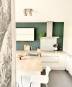 Une cuisine semi ouverte à l'espace de vie avec des meubles en laque blanche, un plan de travail bois et une touche de vert profond pour donner du caractère