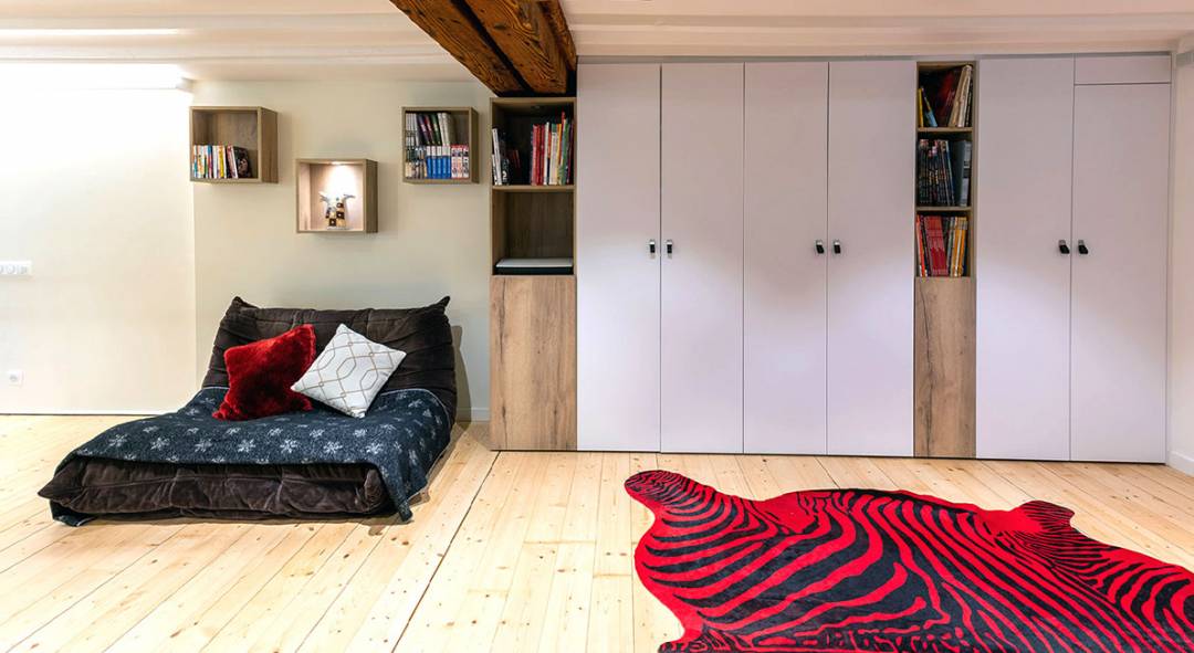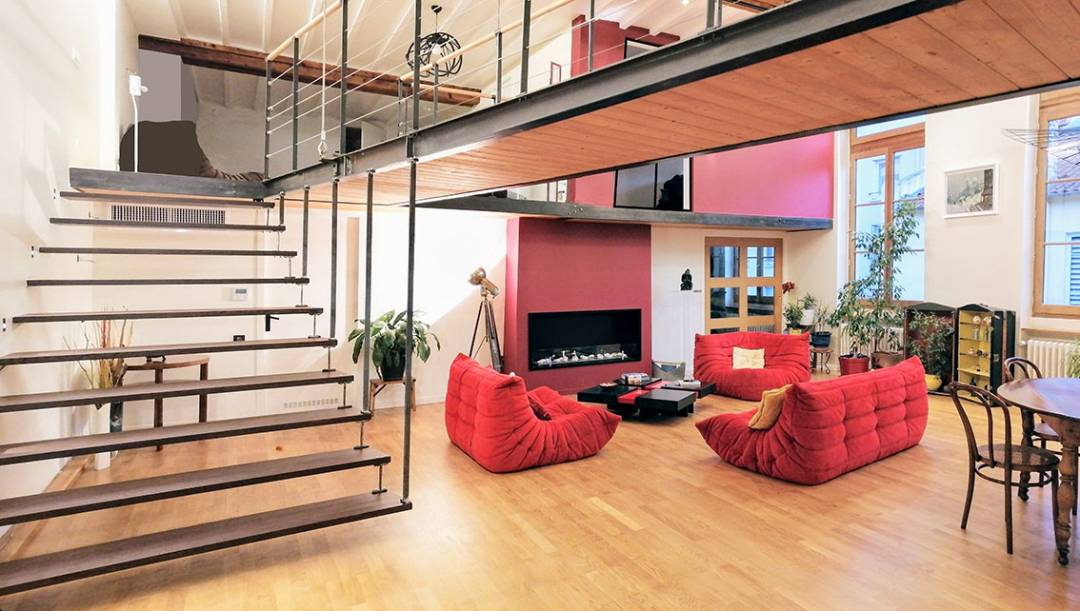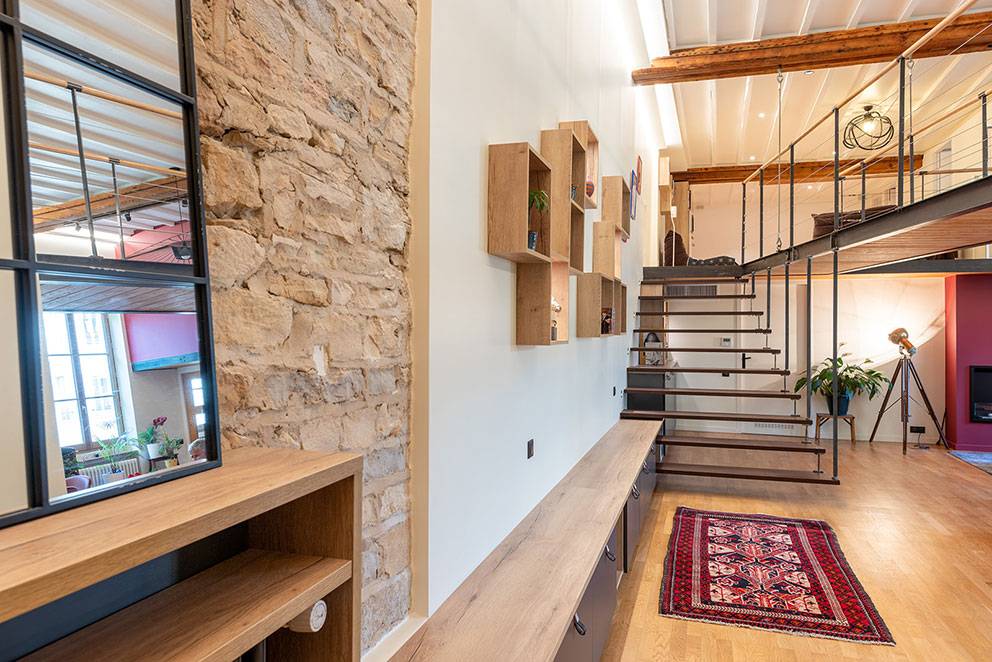 Restructuration et rénovation de cette grande pièce à vivre de 100 m², recouverte, du sol au plafond par de la toile jaunie. Repositionnement d'un escalier suspendu, accueillant, grandiose, à l'image des propriétaires Choix des couleurs osés, chaleureux. Agencement sur mesure.