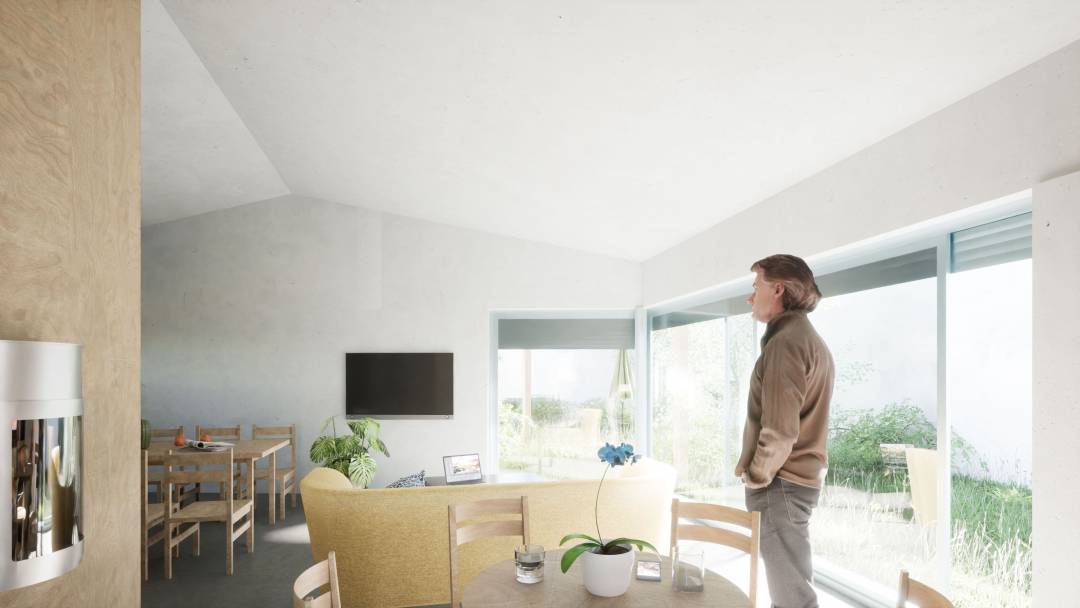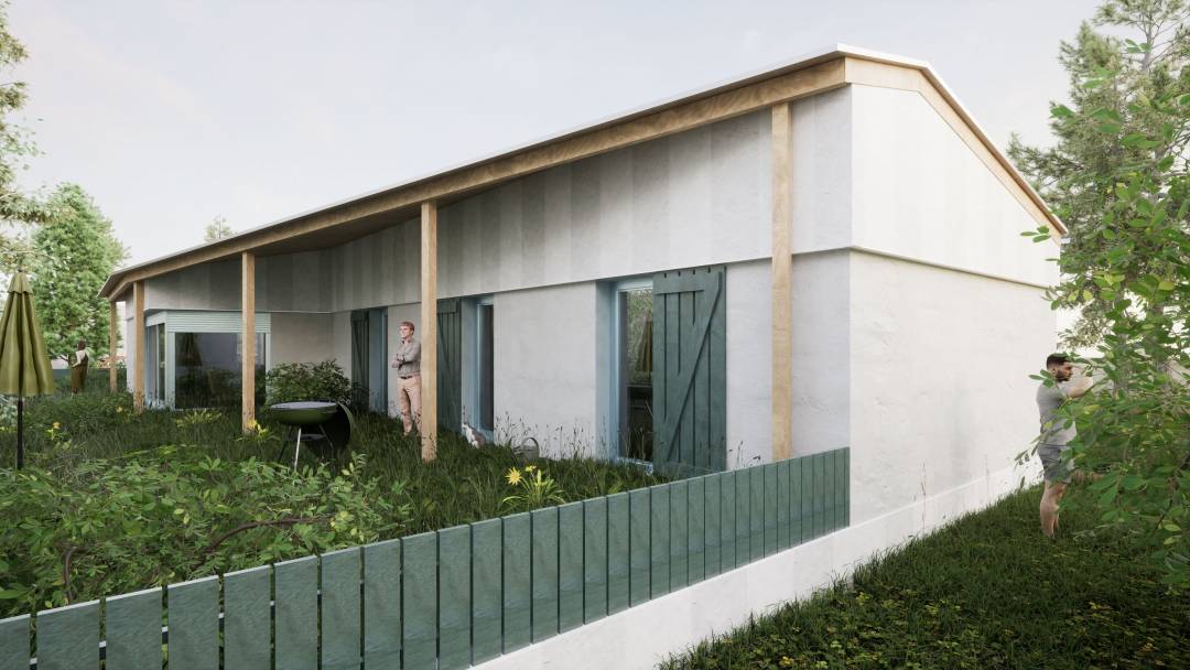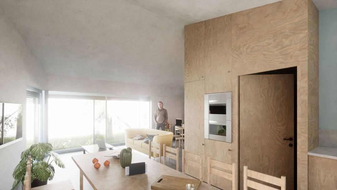 Avec ses murs enduits de teinte claire blanc cassé, ses larges menuiseries bleues en aluminium et ses volets en bois peints assortis, c’est tout l’imaginaire de la maison de pêcheur qui est invoqué. En débord, la toiture en tôle ondulée à deux pans s’appuie sur une enfilade de poteaux en bois, qui jouent le rôle de filtres entre intérieur et extérieur et créent un corridor sur toute la longueur de la maison. Cet espace intermédiaire de transition, qui abrite une terrasse en bois, permet aux occupants de profiter du jardin dès la mi-saison. Ils peuvent y accrocher leurs plantes, un hamac, ou encore s’y asseoir à l’abri du soleil et du vent. À l’intérieur, les surfaces optimisées et les proportions efficaces sont équilibrées par des volumes généreux sous rampants, tandis que les matériaux aux caractères bruts et naturels comme la chape vernie ou encore l’ameublement en contreplaqué donnent au lieu tout son caractère.