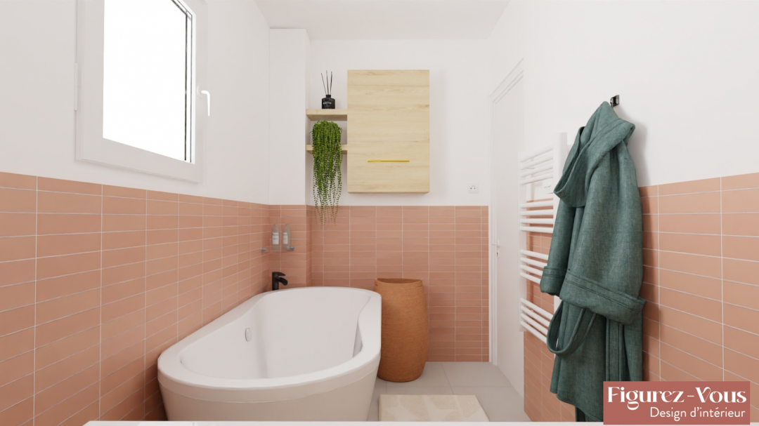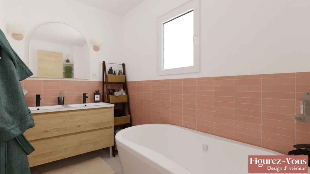 Estelle et son mari ont choisi de me solliciter pour être accompagnés dans le cadre de la rénovation de leur salle de bains familiale de 5 m². Objectif ? Repenser l'aménagement de cette pièce qui a besoin d'être plus fonctionnelle, le tout en respectant trois impératifs : - Conserver une baignoire, en troquant la baignoire d’angle existante avec une baignoire classique, - Avoir une vasque plus large, permettant un usage à deux en même temps, - Conserver des rangements Côté décoration, ils souhaitaient une pièce plus moderne et chaleureuse. Les matériaux et la décoration ont ainsi été pensés de façon à créer une pièce harmonieuse, à la fois sobre et chaleureuse, grâce au mobilier en bois et au carrelage terracotta. Le carrelage posé à mi-hauteur permet un rendu plus moderne et épuré. Enfin pour optimiser la luminosité : deux appliques murales boules dans les mêmes tons doux, ainsi qu’un grand miroir finition laiton. Travaux courant 2024