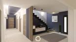 Dès l'entrée, les murs ont été poussés pour créer une pièce à la fois spatieuse et fonctionnelle. L'escalier en crémaillère est mis en valeur par ses deux premières marches lumineuses. Une demi cloison permet de séparer visuellement l'entrée de l'espace jour tout en étant discret.