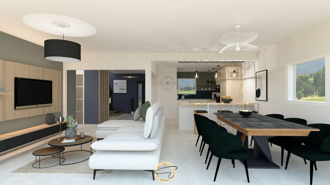La cuisine, semi ouverte sur un grand salon séjour vitré, donne une ambiance claire et lumineuse pour une douceur de vie à la maison.