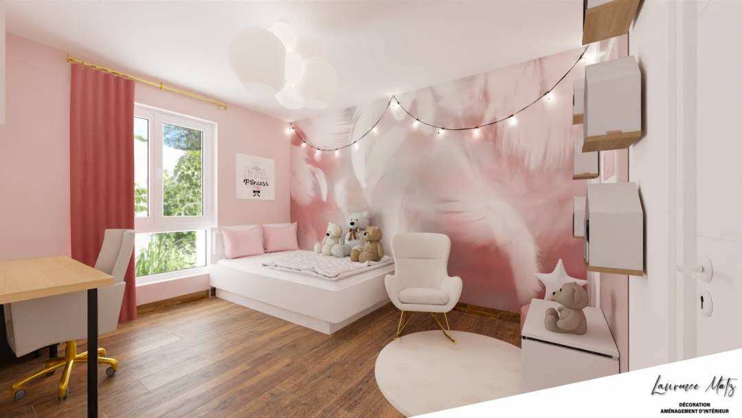 Comme souhaité par mes clients, j’ai travaillé ce projet dans une ambiance douce et apaisante en utilisant des coloris rose pâle et blanc en majorité, qu’il s’agisse de la décoration ou du mobilier. Cette projection a permis à mes clients de valider leurs besoins en mobilier ainsi que les matériaux et coloris utilisés avant d'effectuer leurs achats ! Un résultat final validé à 100% avant même de réaliser les travaux :-).
