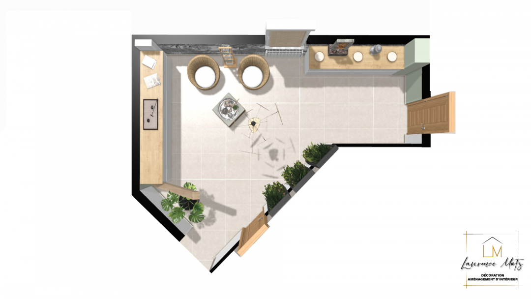 Le besoin était de créer un coin détente dans cet espace ouvert situé à côté de la salle de sport existante avec sauna. Une ambiance propice à la détente permettant de siroter une boisson après l'effort, mais aussi une optimisation des surfaces en intégrant des rangements complémentaires. Résultat validé à 100% par nos clients qui ont pu enclencher sereinement les travaux dans la foulée !