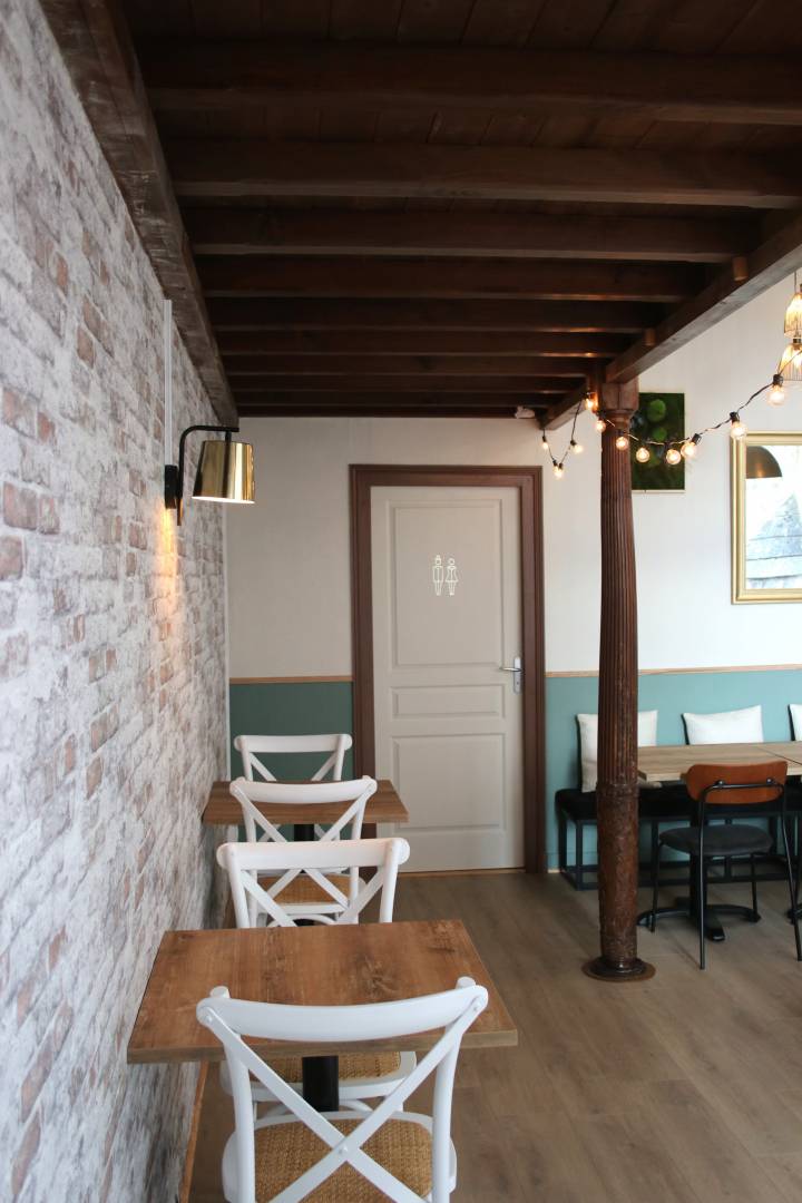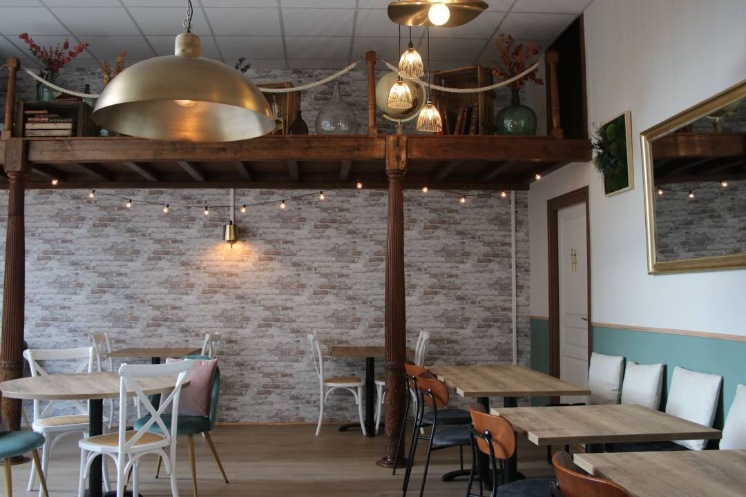 Pour ce projet, mes objectifs annoncés étaient les suivants : 🎯 Travailler sur la création d’une ambiance bien définie mêlant l’industriel, l’authentique et le végétal. 🎯 Imaginer pour eux une palette de couleurs, des matériaux et suggérer des idées de mobilier et d’objets de décoration. 🎯 Projeter leur projet en 3D définissant ainsi avec eux les différents types d’assises et zones de restauration. Pour concrétiser ces objectifs, j’ai débuté par l’élaboration d’un moodboard, regroupant des photos d’inspiration, incluant ma recherche de revêtements et de matériaux. Ensuite, j’ai travaillé sur la projection 2D pour définir les différentes zones de repas, incluant des espaces de détente, des tables, des mange-debout et la cuisine. Une fois cette étape franchie, je suis passée à la conception 3D, intégrant des revêtements muraux et suggérant un soubassement vert pour une touche authentique et végétale. L’atmosphère authentique a été renforcée par l’utilisation de matières douces, du bois, des chaises d’inspiration Louis-Philippe et des chaises de bistrot. Pour accentuer le côté industriel, j’ai opté pour un papier peint en brique blanchie, complété par des luminaires en métal et du cuir, ainsi qu’un canapé chesterfield. Des éclairages indirects et des coussins ont été ajoutés pour une ambiance chaleureuse et confortable. 🌿 Et bien sûr, ma signature : une touche de verdure. J’ai imaginé leur disposition en 3D avant de faire appel à l’expertise de Danses avec les Fleurs et MD’ECO pour finaliser et mettre en œuvre la décoration végétale.