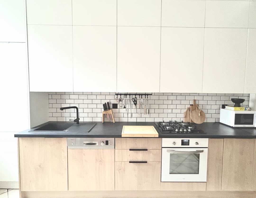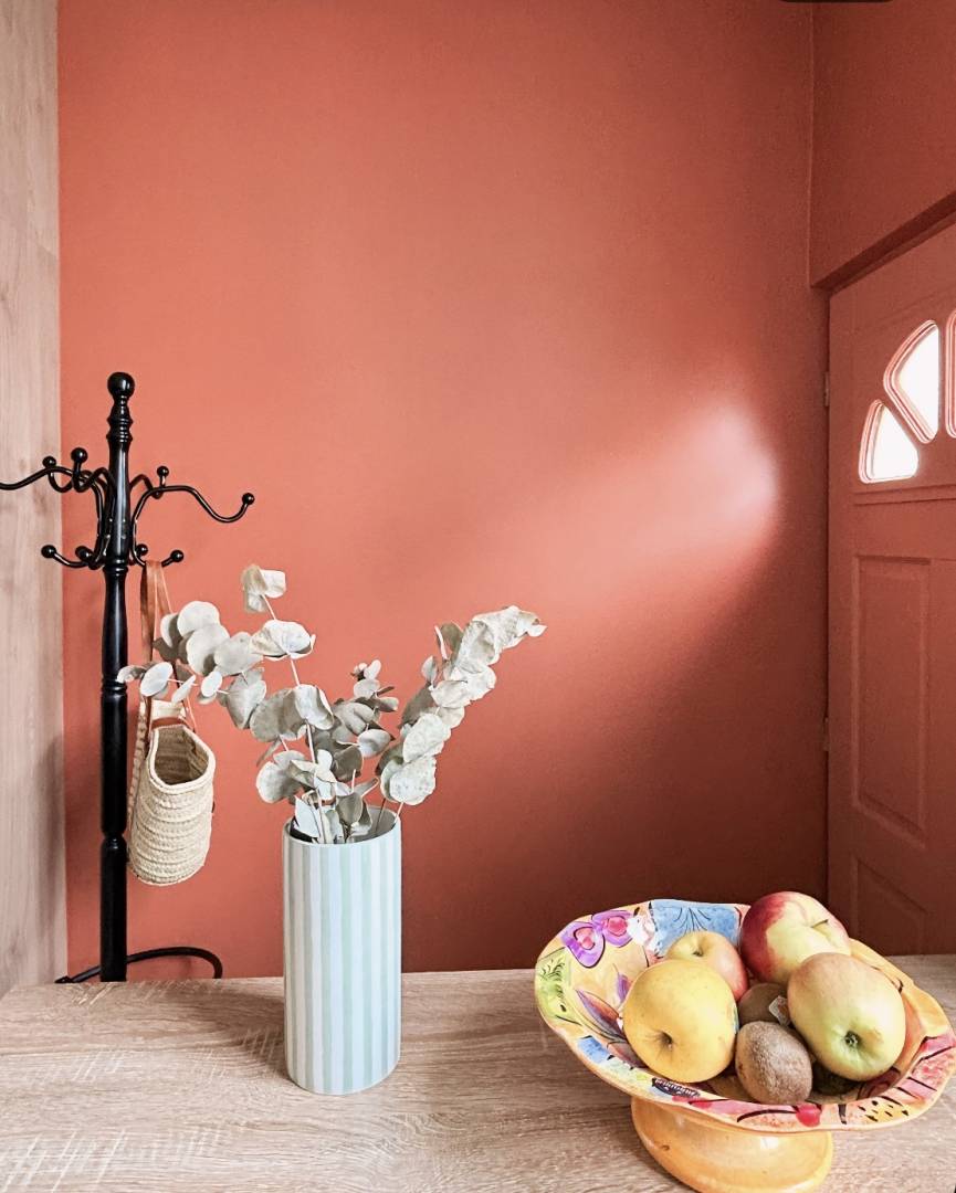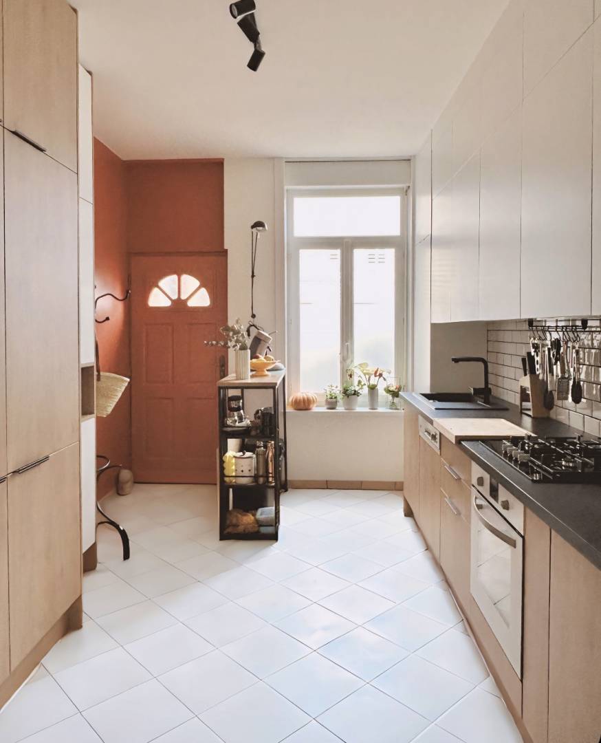 Une nouvelle cuisine qui fusionne harmonieusement esthétisme et fonctionnalité. La couleur chaude appliquée permet de signifier l'espace entrée sans cloisonner l'espace. Le tout a permis de gagner en sensation d'espace et en luminosité