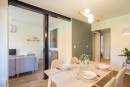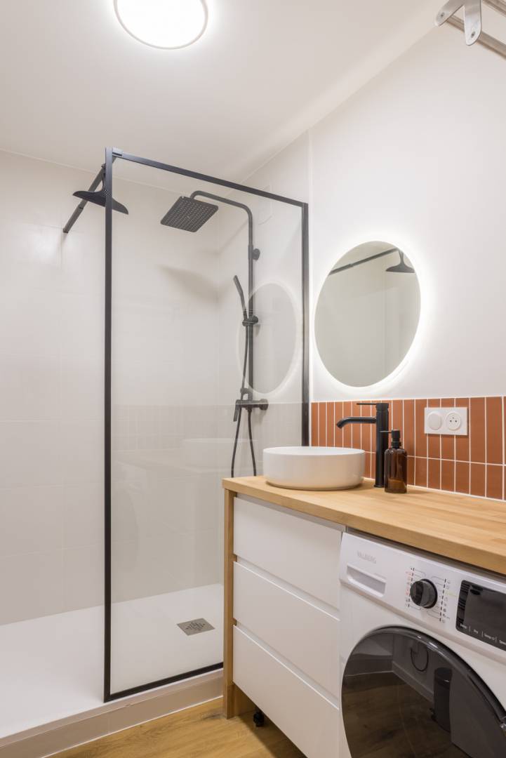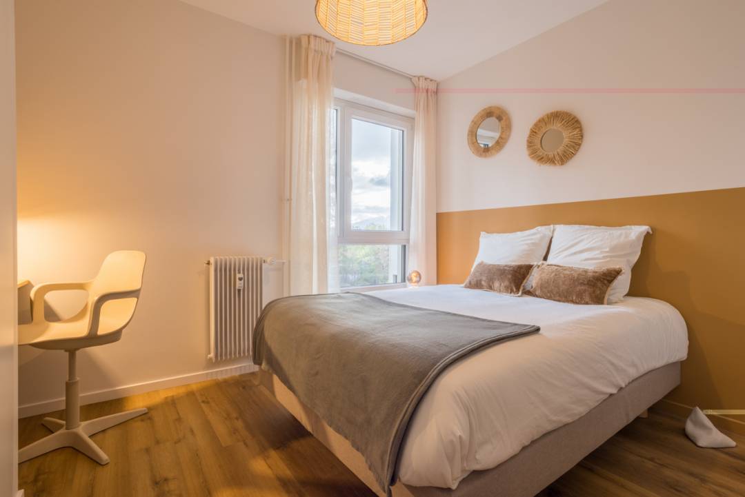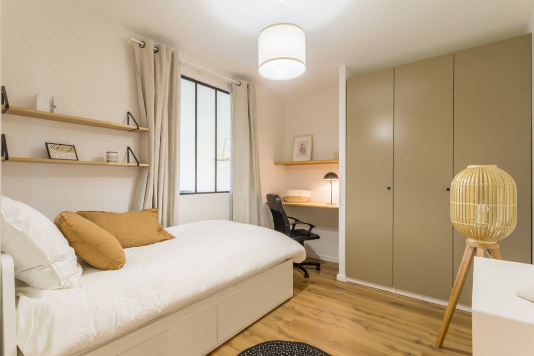 Coup de neuf pour cet appartement de 72m². Dans son jus il avait déjà du potentiel avec sa cuisine ouverte sur le salon par un IPN installé par l’ancien propriétaire. L’ensemble a été totalement rénové du sol au plafond pour créer une ambiance minimaliste et du mobilier qui puisse durer dans le temps, avec une literie de qualité, un sol PVC effet bois résistant au passage. L’ancien dressing, exigu et sans fenêtre a été agrandi en une chambre de 9m² avec verrière métallique. Dans cet aménagement, chaque pièce possède sa propre ambiance avec des couleurs lumineuses et naturelles pour plus de douceur et de modernité. Le choix judicieux de quelques objets déco permet d’embellir le bien dès le premier coup d’oeil. La preuve en est, l’appartement a trouvé ses locataires dès la fin des travaux.