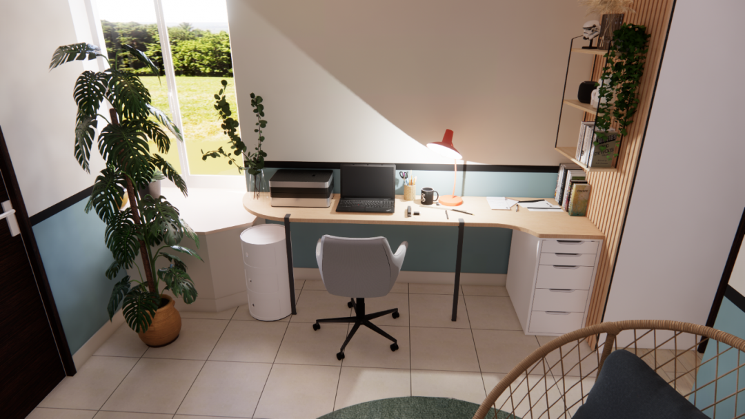 - la cliente avait besoin d'un espace pour télé-travailler : la fonction du volume créé était une évidence. D'autant que la fenêtre donne sur le jardin exposé sud !