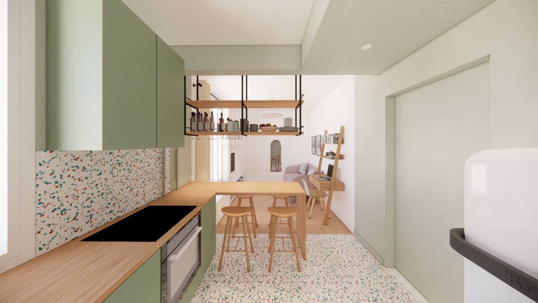 Cet appartement de 35 m² a été entièrement réaménagé pour un style de vie contemporain. La cuisine, ouverte sur le séjour après la suppression de la cloison, intègre un plan de travail se prolongeant en table à manger, avec des étagères suspendues au-dessus pour un rangement pratique et esthétique. La salle de bain, redessinée, allie élégance et fonctionnalité avec des matériaux de qualité, une douche moderne et des rangements optimisés. La chambre, redécorée, offre une ambiance apaisante et un confort maximal grâce à une palette de couleurs harmonieuses et des meubles fonctionnels. Chaque détail a été pensé pour maximiser l’espace et offrir un cadre de vie agréable et stylé, idéal pour un quotidien confortable et moderne.
