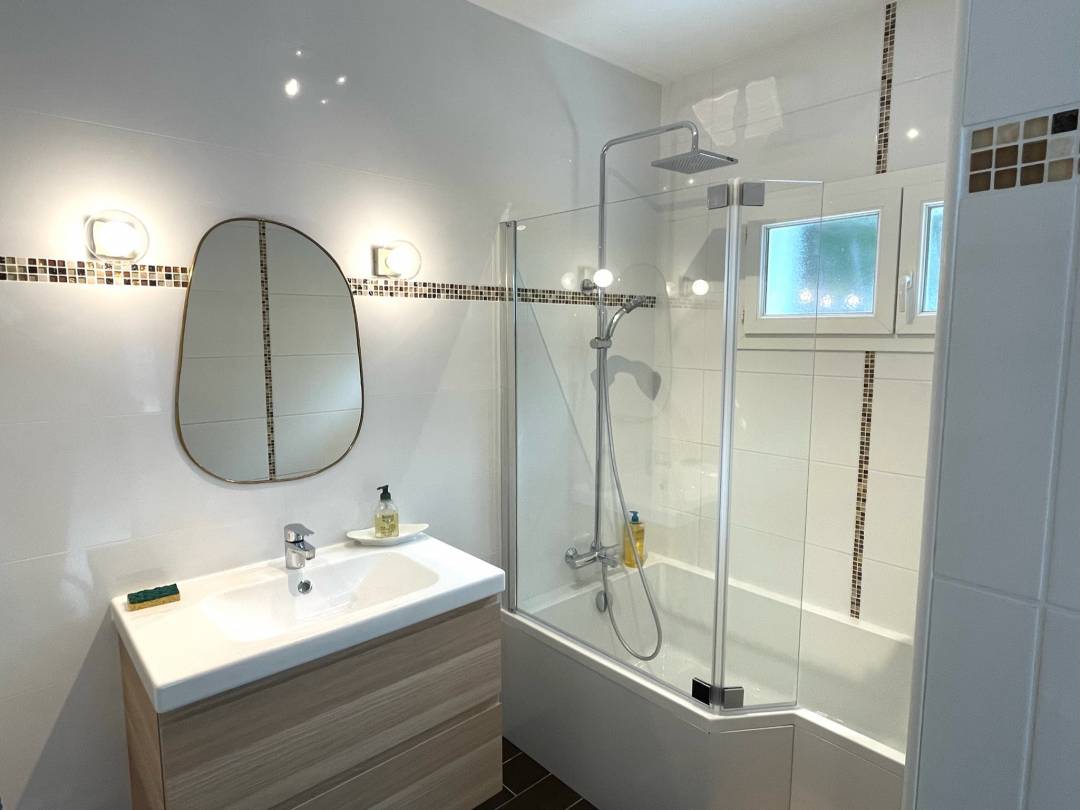 Pour ce projet de transformation d'une salle d'eau en salle de bain (dans un petit espace !) il a suffit de déposer la double vasque (trop encombrante) et casser la douche (trop étroite et qui cachait la lumière naturelle). La nouvelle baignoire-douche a ensuite été posée, un seul mur de carrelage refait, puis pose d'une vasque simple avec son meuble suspendu.