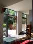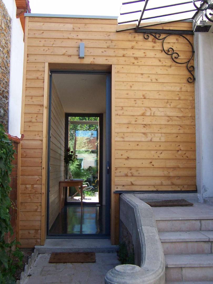 Le projet consiste en la création d’une suite parentale à l’étage, et d’un vaste espace de vie à rez-de-chaussée La chambre de la suite parentale est située en façade arrière, côté jardin, dans le volume de l’extension. Le dressing et la salle de bains sont placés dans l’existant, moyennant transformations. L’extension est implantée en façade arrière Ouest, de limite à limite. Elle englobe l’excroissance formée par l’agrandissement antérieur de la cuisine. De plain-pied avec le jardin, elle se décompose en trois volumes. Le volume de l’entrée est en retrait de la nouvelle façade Ouest, permettant la pose d’un vitrage d’angle bénéficiant de l’apport solaire Sud, et élargissant la perspective. Le prolongement extérieur du pignon, bardé de mélèze, tant à l’intérieur qu’à l’extérieur, permet le respect des contraintes de vues. On accède au volume de l’entrée par deux portes vitrées toute hauteur, se faisant face, qui permettent la transparence sur le jardin en fond de parcelle.