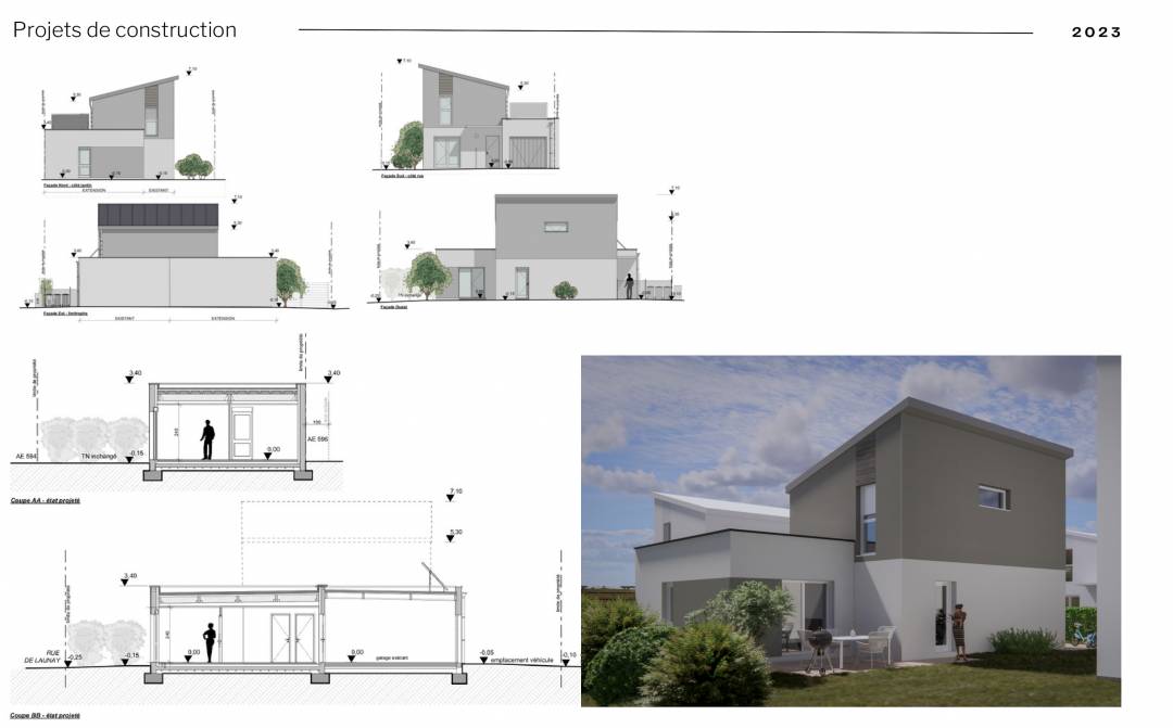 Extension d'une maison en lotissement , en Bretagne : reprise des plans existants puis proposition de l'état projeté - constitution du dossier de déclaration préalable de travaux en collaboration avec un architecte DPLG.