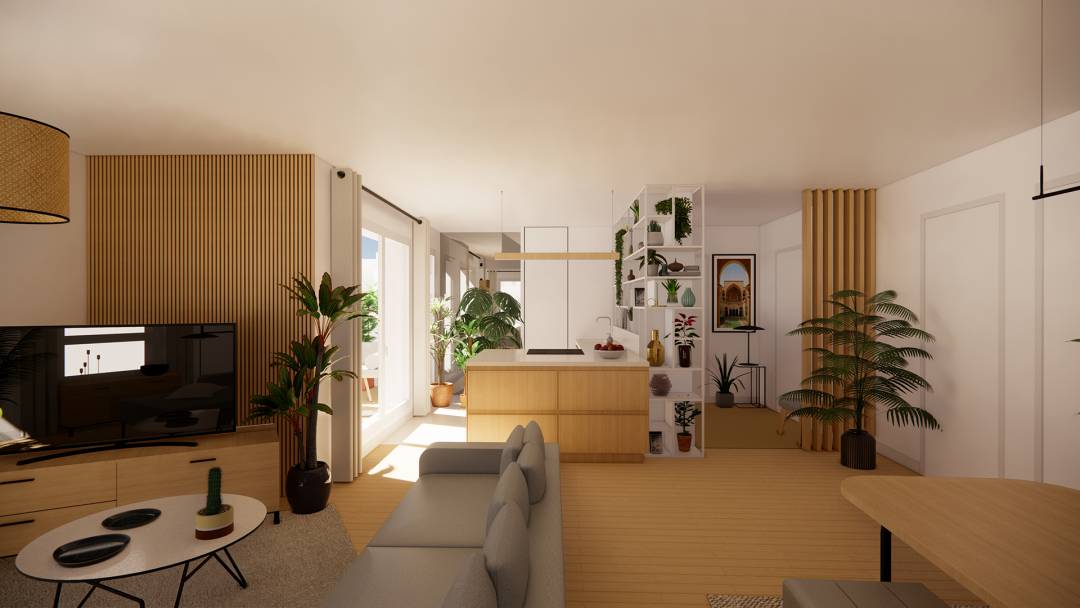 L'appartement se situe en Seine-Saint-Denis, en banlieue parisienne, acquis dans le cadre d'une VEFA. Il était initialement conçu comme un T3 classique avec des espaces très fermés. Il a été réaménagé comme un grand T2 avec une pièce de vie généreuse, en supprimant une chambre à coucher. Cette nouvelle configuration permet à la pièce de vie de profiter plus largement de la lumière grâce aux nombreuses baies qui l'entourent. L'entrée et la cuisine sont séparées d'une cloison ajourée formant une étagère. Avec le claustra, elle permet de délimiter les espaces sans les fermer totalement.
