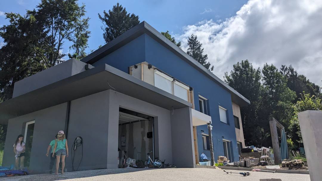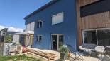 Les clients rêvaient d'une maison bleue, étant amoureux de cette couleur... Nous avons réussi à trouver la teinte qui s'hamonise parfaitement avec un beau ciel d'été, et qui se marie parfaitement avec le bardage bois et les éléments métalliques gris.