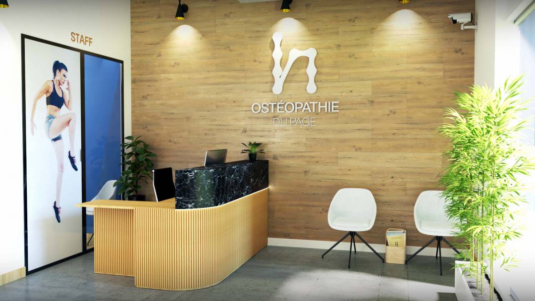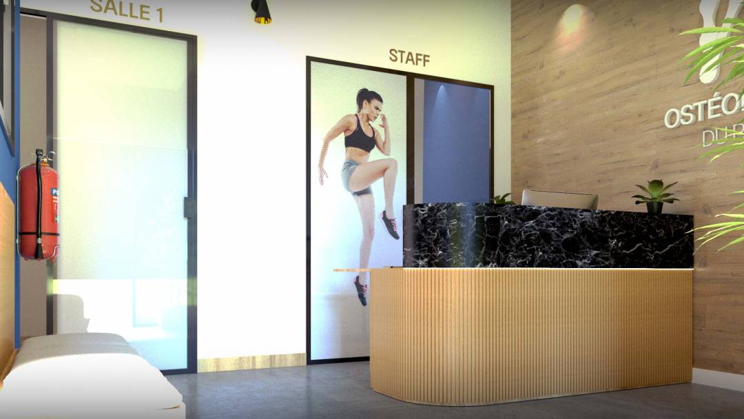 Conception de l'espace d'accueil d'un cabinet de kinésithérapeute, création de mobilier d'accueil sur mesure, développement d'une signalétique en harmonie avec le logo et la décoration du local.