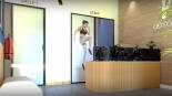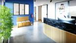 Accueil confortable et écologique pour une clientèle médicale, associant des éléments en bois pour un effet chaleureux et invitant.