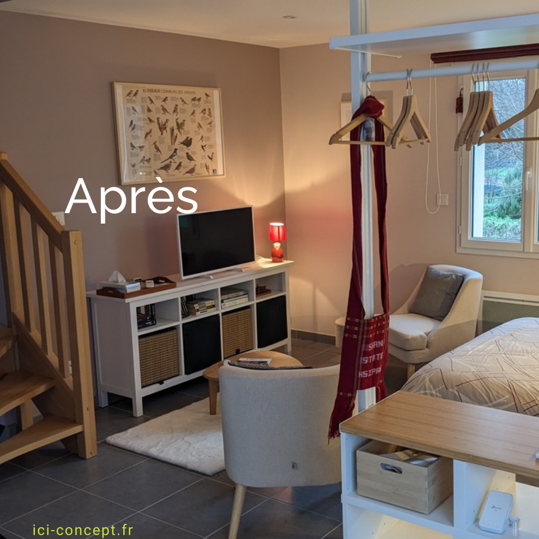 Transformation d’un garage en studio duplex tout confort pour location saisonnière Les propriétaires disposaient d’une dépendance dont une partie était utilisée comme garage pour 2 voitures. Ils ont souhaité valoriser la partie garage pour la rendre habitable et en faire un gîte de location saisonnière indépendant.