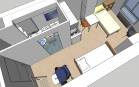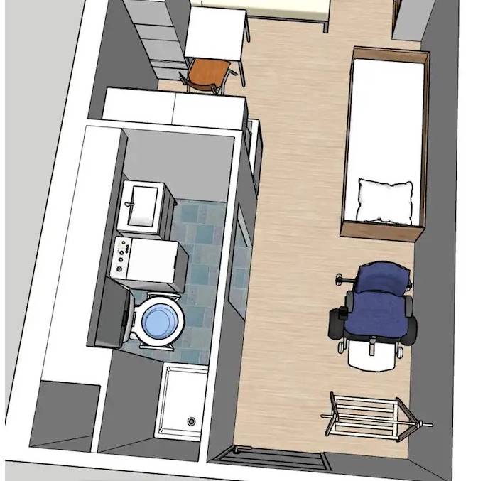 La cliente a acheté récemment ce logement pour disposer d’un pied-à-terre à Paray-le-Monial où elle se rend régulièrement pour des courts séjours allant de quelques jours à plusieurs semaines. Cet habitat n’est pas du tout adapté à ses contraintes : en effet Laurence est lourdement handicapée des membres inférieurs, ce qui l’oblige notamment à circuler en fauteuil roulant électrique à l’extérieur et utiliser deux béquilles pour tous ses déplacements à l’intérieur. Les besoins Avoir en permanence un point d’appui à l’arrière et sur les côtés à moins de 80 cm, Pouvoir manoeuvrer et parquer le fauteuil roulant d’une taille imposante Accéder au lit du côté droit pour se coucher et du côté gauche pour se lever, Une douche fermée sur 3 côté avec des barres de maintien, Avoir la possibilité d’accueillir 2 personnes à déjeuner et 1 personne (idéalement 2) à dormir, Pouvoir prêter son appartement à un couple avec 1 enfant lorsqu’elle ne l’occupe pas … Tout ceci dans 20 m2, avec un budget réduit et en n’oubliant pas de penser à la revente !