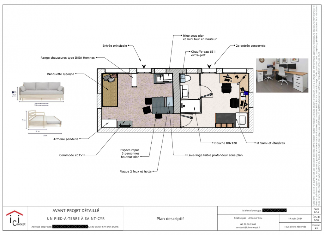 M. et Mme L. disposent d'une dépendance aménagée en 2 studios locatifs. Ils ont fait appel à ICI-CONCEPT pour transformer ce logement en un 2 pièces tout confort pour y loger ponctuellement leur fille et son fils. Après inventaire des besoins et relevé de l'existant, 3 propositions d'avant-projets sommaires ont été fournies. Les clients ont ainsi pu connaître tout le potentiel de leur logement et choisir la solution la mieux adaptée à leurs souhaits et à leurs contraintes budgétaires.