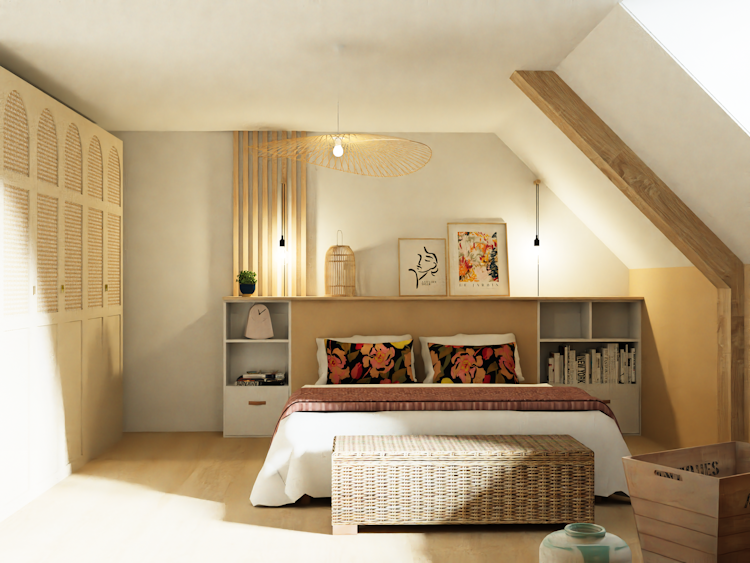 Nous avons dessiné une tête de lit sur mesure pour pouvoir y insérer l'électricité ainsi que le rangement nécessaire. Les couleurs et les tissus ont été choisis en concertation avec les propriétaires pour correspondre à leurs envies.