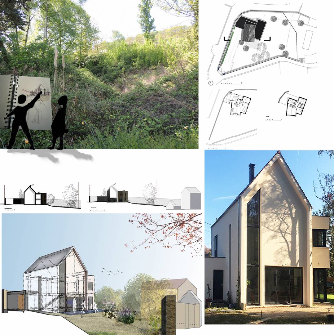 La maison pour une famille composée d'un couple et de leur deux jeunes enfants, s’implante opposée à la demeure existante au Sud du terrain. Une grande baie connecte la terrasse pour octroyer le maximum de lumière au séjour en double-hauteur qui s’oriente à l'ouest, ombragé naturellement.