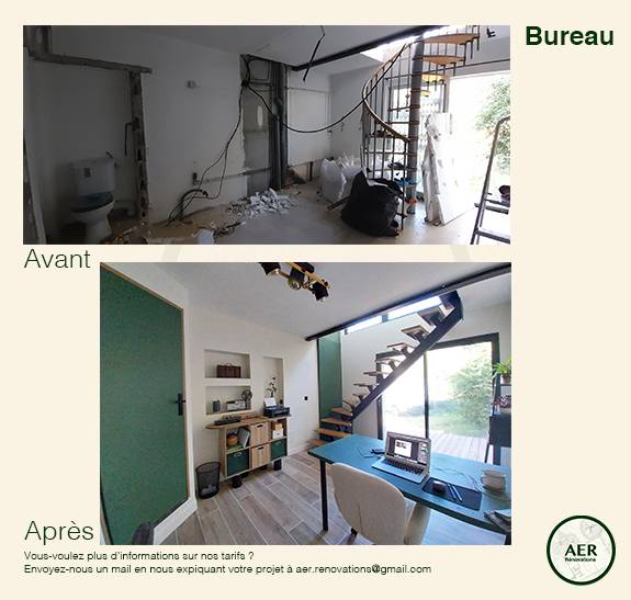 Nous sommes fiers de partager l'une de nos récentes réalisations : La transformation d'une salle de bain en un bureau fonctionnel avec WC. Cette pièce nécessitait une rénovation globale et un véritable changement de fonction afin d'être mise en valeur. La rénovation s'est concentrée sur plusieurs points : - Remplacement de la baie coulissante PVC par une élégante baie coulissante en aluminium, apportant modernité et luminosité. - Isolation des murs par l'intérieur, garantissant confort et efficacité énergétique. - Remplacement de l'escalier colimaçon par un escalier un quart tournant à limon central en métal, agrémenté de marches en chêne massif, alliant esthétique et robustesse. Chez AER Rénovations, nous sommes passionnés par la création d'espaces qui allient fonctionnalité et design. Chaque projet est une nouvelle opportunité d'innover. Vous avez un projet de rénovation en tête ? N'hésitez pas à nous contacter ! #AERRénovations #Rénovation #Transformation #DesignIntérieur