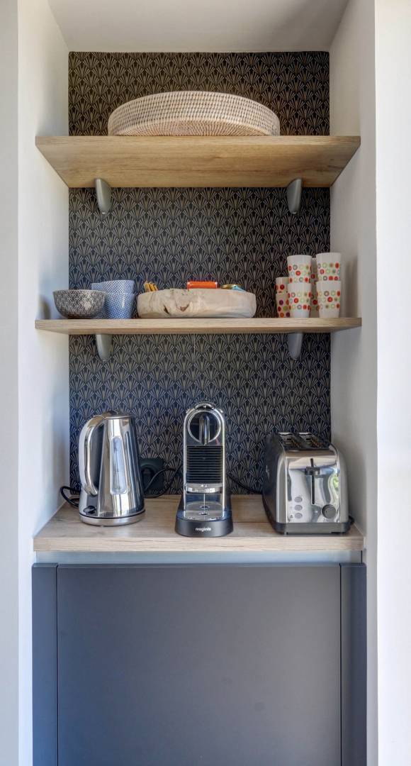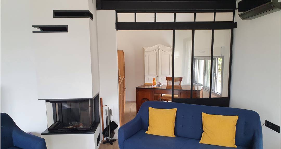 La maison avait besoin d'une rénovation complète suite à l'acquisition des nouveaux propriétaires. J'ai accompagné les clients pour une rénovation radicale de cette maison. Une maison avec une vue imprenable sur la Vallée de la Vienne. Le but a été d'ouvrir au maximum par des baies et des déposes de cloisons pour transformer cette maison en un lieu actuel : magique et chaleureux. J'ai imaginé et créé une nouvelle ambiance en jouant avec les matériaux dans un style épuré. L'ancien garage est devenu un bureau. La cloison de la cuisine est tombée pour intégrer celle-ci au séjour. une cheminée contemporaine est venue à la place de l'ancienne. Une extension a été ajouté pour créer la suite parentale contenant la chambre, la salle de bains et le dressing. Les matériaux utilisés sont le bois, l'effet marbre et un papier-peint pour habiller une niche de la cuisine.