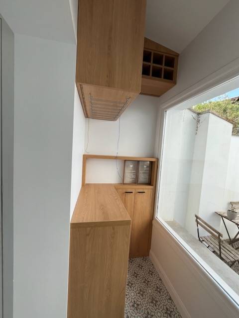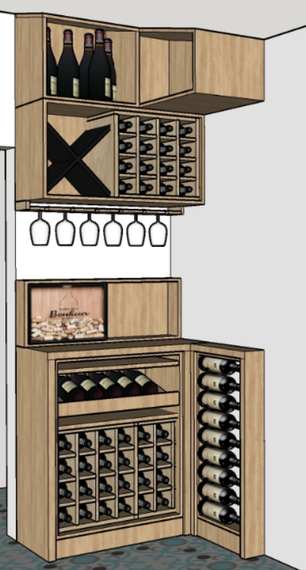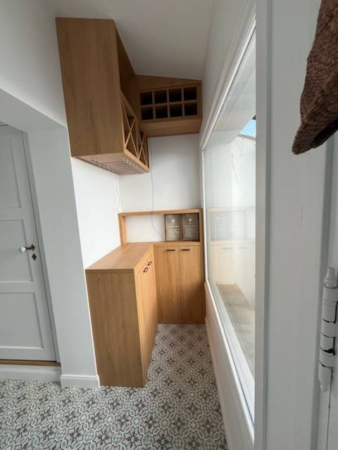 Cet espace étant un des plus frais le maison, le souhait des clients était d'optimiser ce petit espace/recoin pour installer un meuble sur mesure leur permettant de ranger leur nombreuses bouteilles de vins.