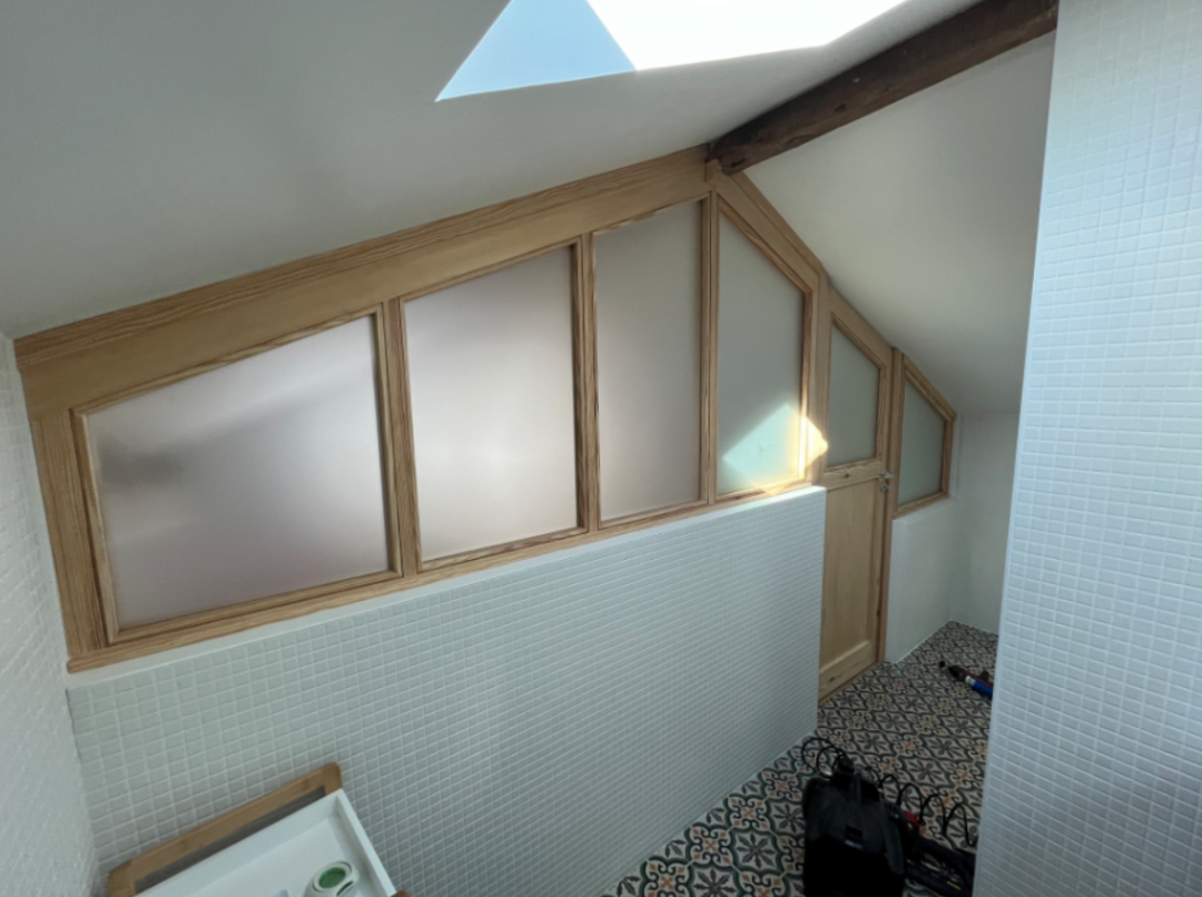 Conception d'une verrière en bois pour séparer une salle de bain et une chambre dans un espace parental sous combles.