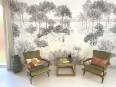 C'est chose faite dans ce petit salon avec son papier peint au motif de pins et de sable ainsi que les différentes touches de vert, rappelant l'environnement direct de la maison.