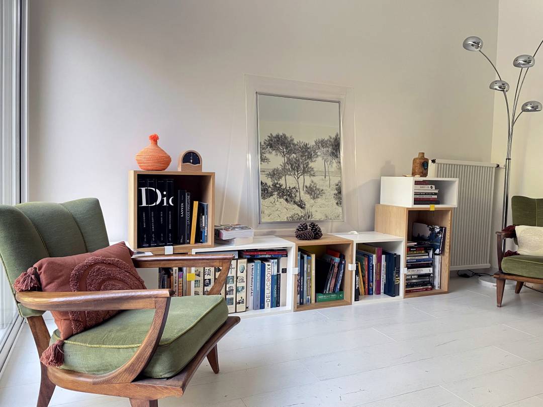 Transformation d'une chambre en 2e salon qui donne sur le jardin.  Cette pièce est très agréable en été comme hiver pour se détendre avec un bon livre ! Un lit est placé dans cette pièce quand il y a besoin de place supplémentaire pour les invités.