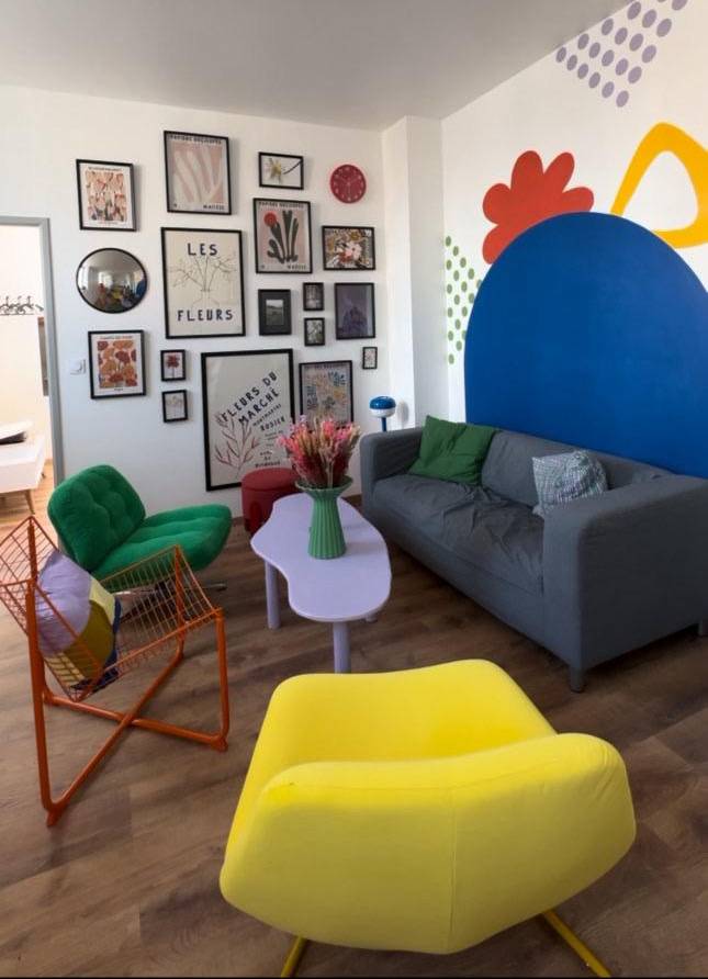 L’objectif était de créer une atmosphère dynamique et pleine d’énergie pour un lieu d'accueil professionnel dans les bureaux d'une rédactrice/community manager, inspirée de l’univers pop et des années 70-80 ! Ici, la clé réside dans le choix des couleurs : du orange vif, du bleu électrique et des touches de vert et de jaune. 🎨 J’ai également joué avec des formes géométriques et des motifs graphiques pour ajouter du caractère à la déco – un moyen parfait pour réveiller un mur blanc ! Qui dit déco unique, dit DIY ! Vous trouverez en photo quelques créations maison pour donner une touche personnelle et design.