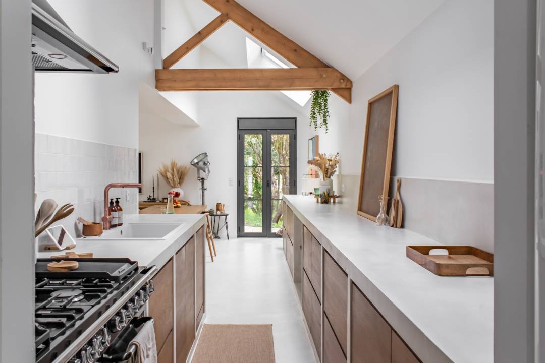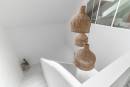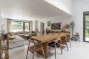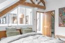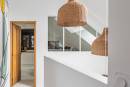 Dans cet intérieur pensé avec une précision architecturale et une sensibilité au naturel, chaque espace raconte une histoire. Le bois brut et les teintes organiques dominent, apportant une chaleur intemporelle et une authenticité rare. Des luminaires en rotin tressé éclairent subtilement des espaces baignés de lumière naturelle, tandis que les ouvertures et verrières permettent une connexion visuelle fluide entre les pièces, créant une sensation d'harmonie et d'ouverture. La cuisine, avec ses lignes épurées et ses matériaux naturels, se veut à la fois fonctionnelle et accueillante, un véritable cœur de la maison. Dans les chambres, le jeu des textures – draps de lin, poutres apparentes et murs texturés – invite au repos et à la sérénité. Chaque élément de décoration semble avoir été choisi avec soin, des œuvres d’art vibrantes qui ponctuent les murs aux objets artisanaux qui ajoutent une touche personnelle et vivante. Les salles de bain marient minimalisme et charme rustique, avec des finitions mates et des touches dorées pour une élégance discrète. Cet ensemble illustre une parfaite symbiose entre design épuré, respect des matériaux et fonctionnalité contemporaine, créant un espace qui inspire et apaise.
