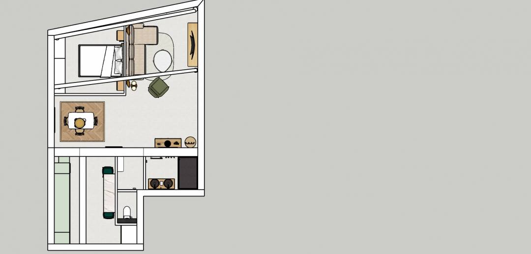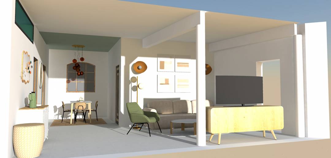 L'espace sera aménagé de façon à créér une chambre tout en laissant un espace suffisemment agréable et fonctionnel pour les salon/ salle à manger.