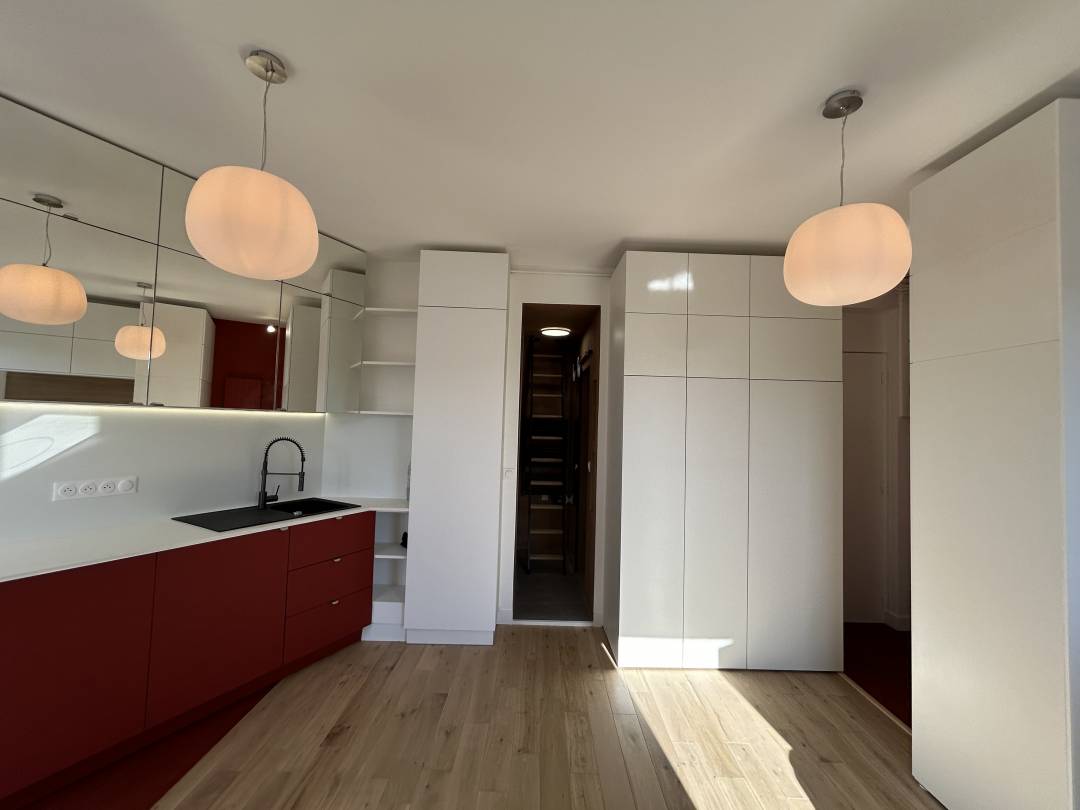 Petite surface, beaucoup de rangements qui permettent l’agencement de différents espaces, une entrée bien délimitée, un bureau, cuisine et coin repas.