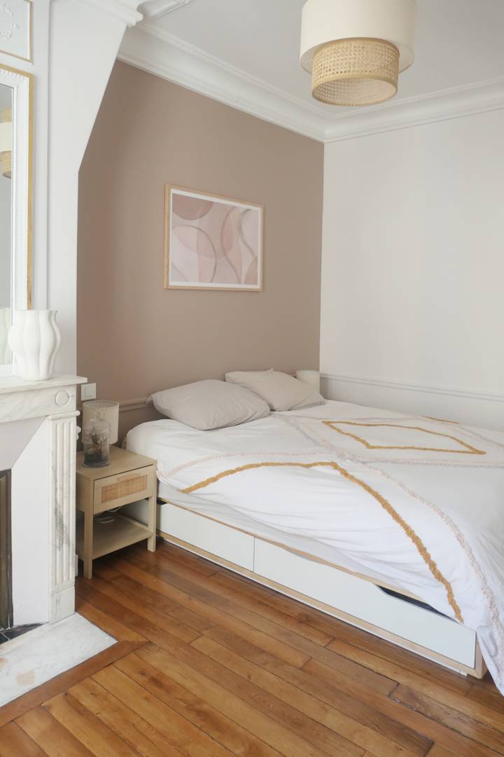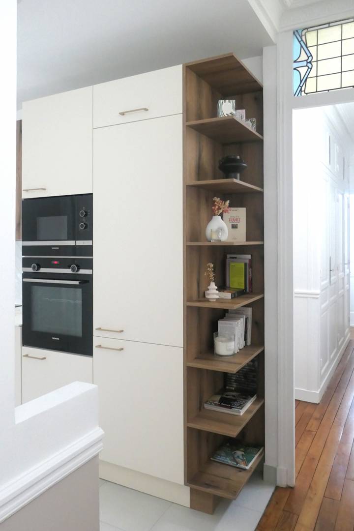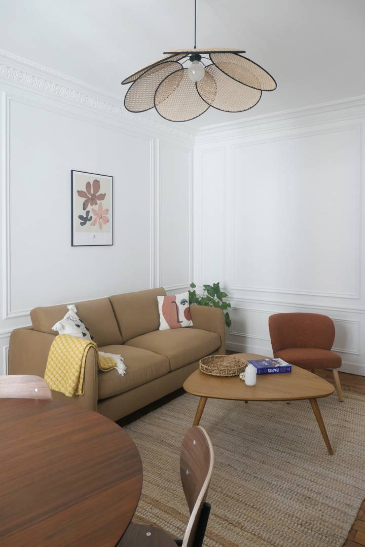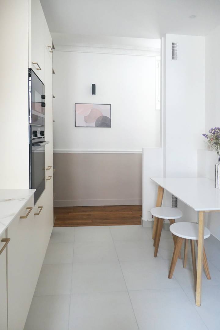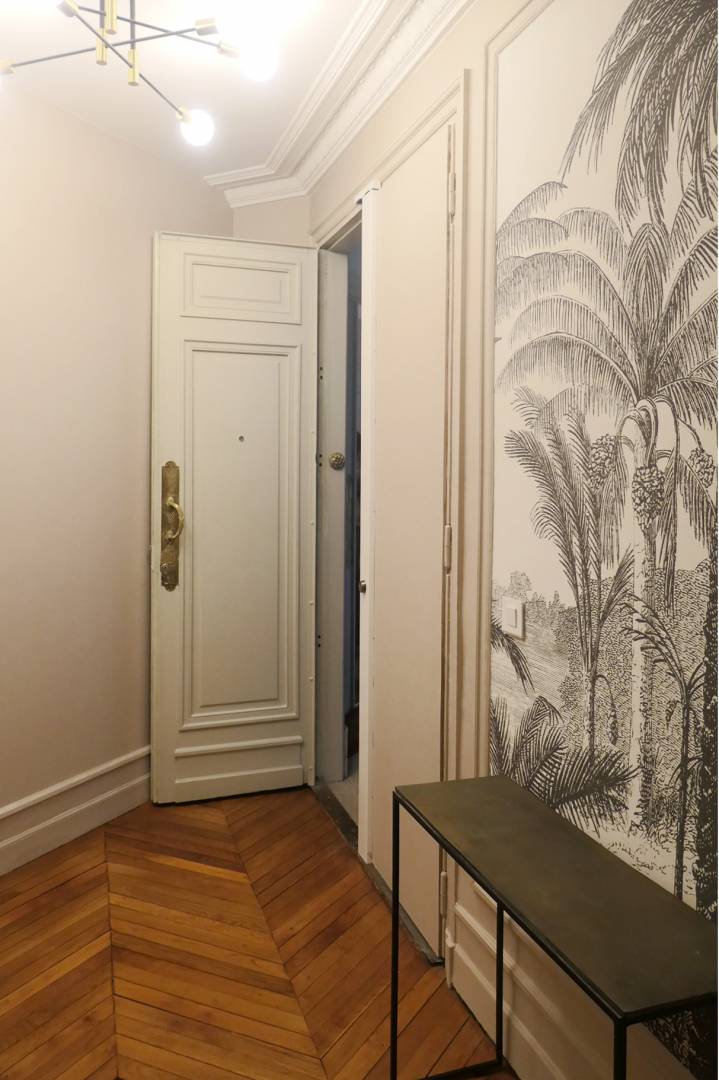 L’existant : Il s’agit d’un appartement Haussmannien qui a été divisé en deux parties et dont les pièces sur rue ont été annexées à l’appartement voisin. Notre mission est de transformer la partie restante, moins noble et donnant sur cour, en un appartement destiné à la location. Malgré une entrée très sombre et un très long couloir, les différentes pièces, sont toutes équipées de fenêtres et sont très lumineuses. Le projet : Cet appartement destiné à la location doit être ergonomique, élégant et confortable. Le manque de lumière naturelle dans l’entrée est compensé par une décoration soignée ; la longueur du couloir est ponctuée par des fenêtres neuves laissant entrer la lumière du jour. La cuisine est ouverte sur le couloir ce qui permet d’en couper la longueur et d’apporter beaucoup plus de luminosité, en double exposition. La pièce à vivre est séparée en deux zones : un espace salon et un espace dinatoire. Des meubles simples mais élégants ainsi que de beaux matériaux apportent une certaine noblesse à la pièce. Les moulures murales ont été redessinées afin d’apporter cette touche parisienne propre aux immeubles haussmanniens.