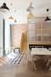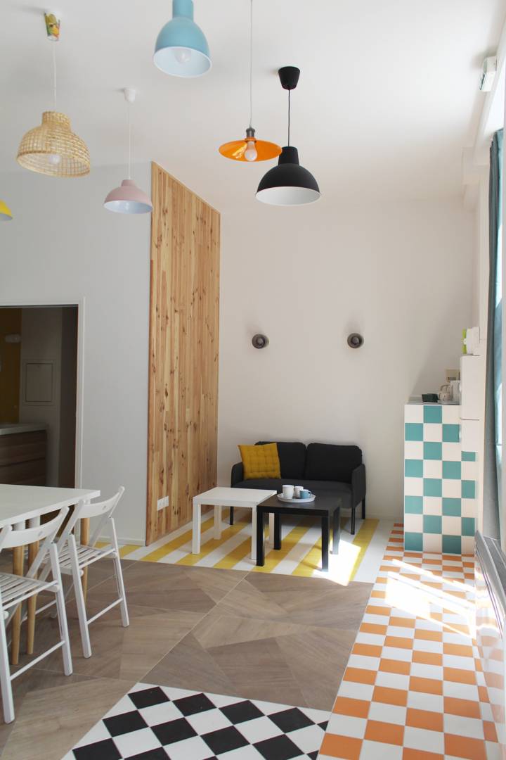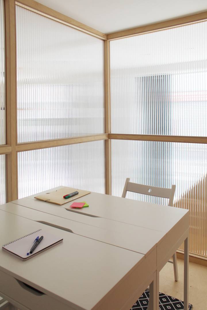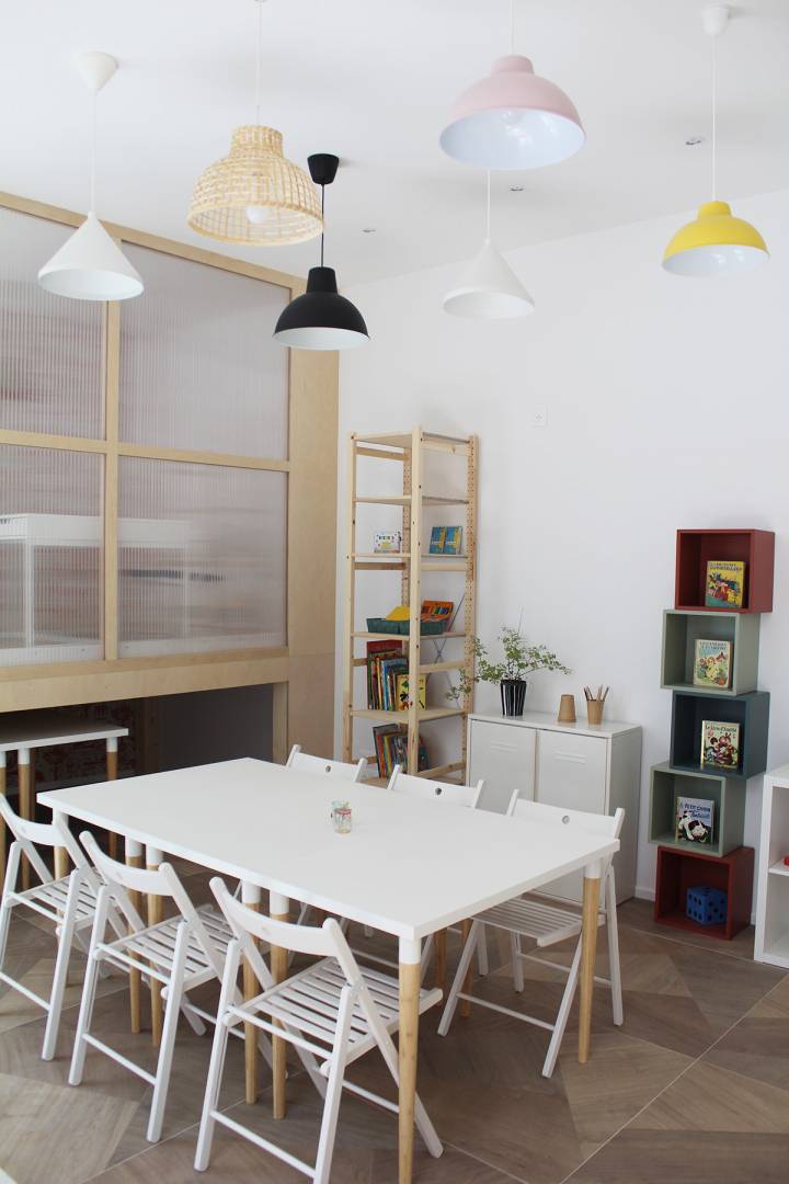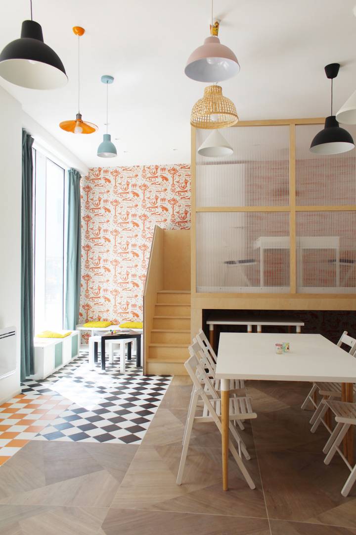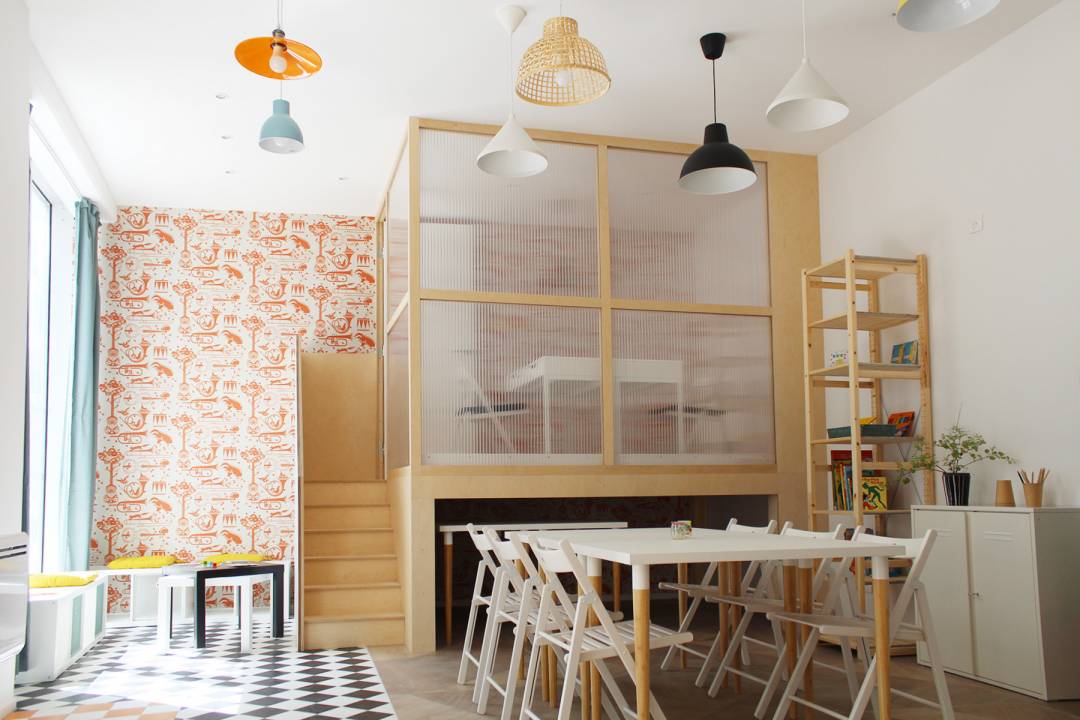 L’existant : Il s’agit d’un espace commercial très lumineux, de 43m² sur rue, brut de béton et bénéficiant d’une belle hauteur sous plafond. Le projet : L'AFEV (Association de la fondation étudiante pour la ville), souhaite utiliser cet espace très visible de l'extérieur pour des activités socio-éducatives. Il doit permettre de recevoir des groupes de tailles diverses (jusqu'à 10 personnes) pour des activités diverses (aide au travail, ateliers, projections, activités manuelles pour les enfants, réunions, formations …) Il doit donc être modulable, le mobilier devant être rangé et remis en place facilement, et comporter des espaces de rangement. Un bureau séparé doit également être créé pour 2 salariés. Ce bureau, comme une bulle isolée, est installé dans une cabane montée sur pilotis. Le volume disponible sous la cabane devient ainsi un espace de stockage facilement accessible. Le lieu, en partie à destination d’un jeune public, se doit d’être ludique. Nous mélangeons les couleurs de l’association à des motifs graphiques forts. Les matériaux (lambris, papier-peint, carrelages) viennent définir les différentes zones : accueil, sanitaires, détente, lecture et activités centrales intermittentes. En arrière plan, un grand mural de rangement, sera complété au fur et à mesure par du mobilier de récupération. Les lustres dépareillés renforcent cette idée de cabane bricolée.