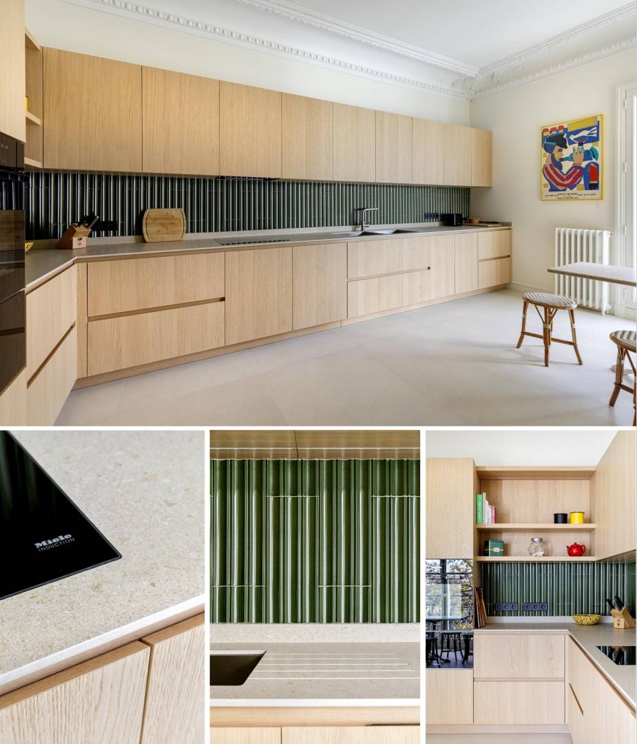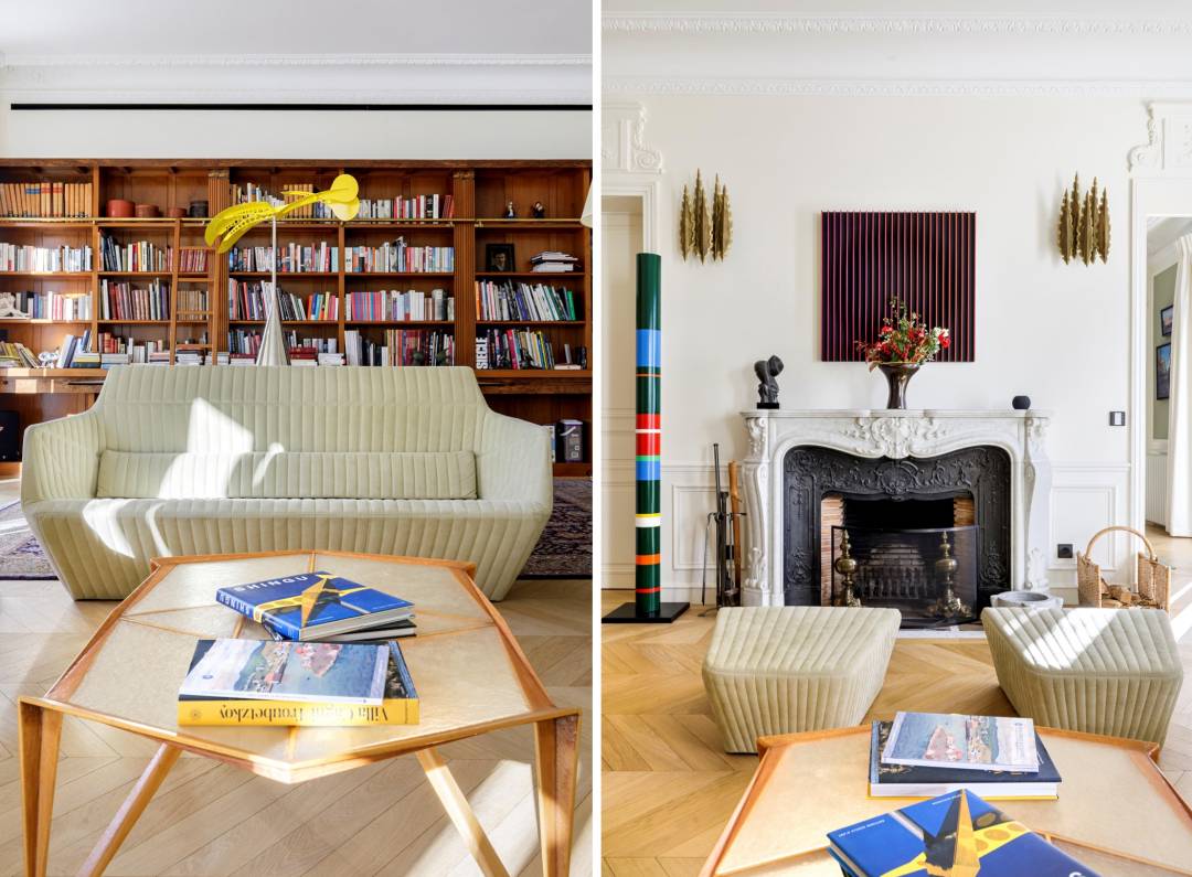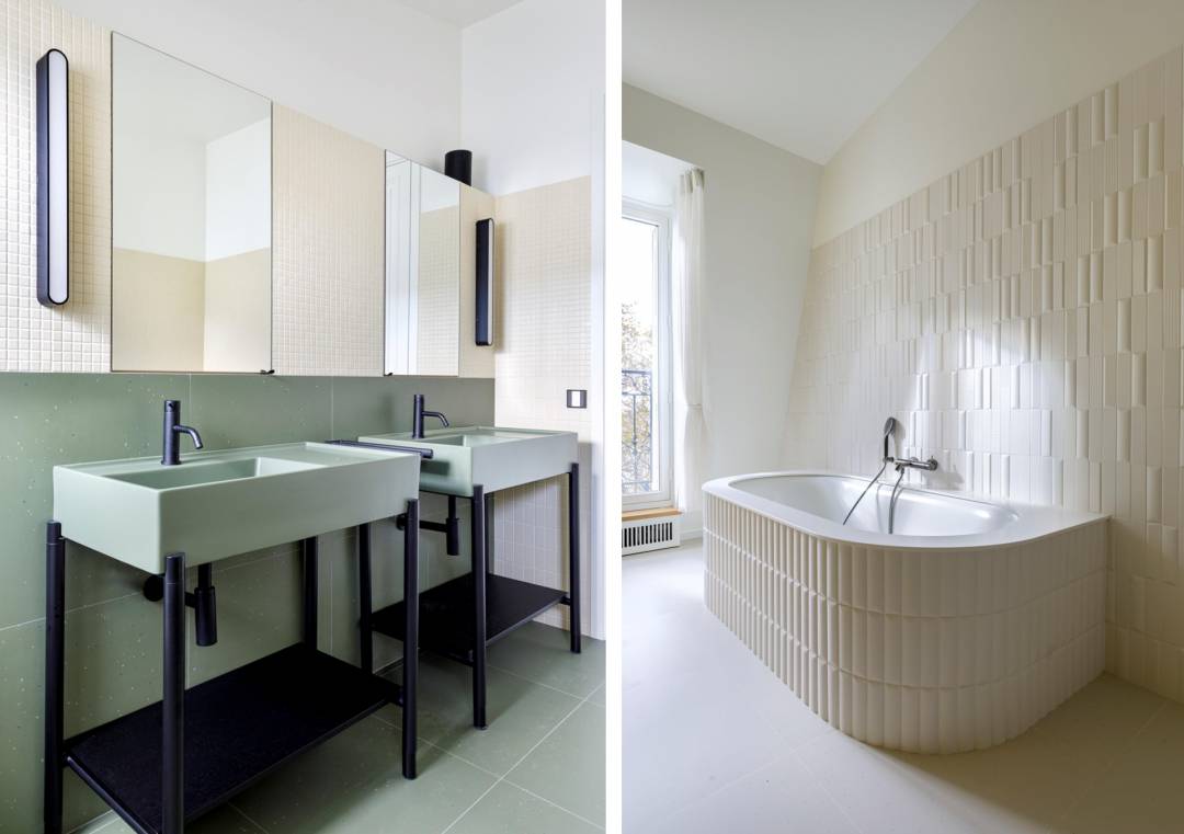 A l’origine, ce duplex à la situation exceptionnelle faisant face à la tour Eiffel était constitué d’un appartement classique au 5ème étage relié à une chambre au 6ème étage L’ensemble avait subi des travaux de rénovation qui l’avaient dépouillé des éléments caractéristiques de l’architecture haussmannienne; tel que le parquet ancien, cheminées, moulures…, seules deux pièces possédaient des corniches Dans le cadre d’une mission complète, nous avons pu maitriser le projet des prémices de la conception jusqu’à la livraison, alliant une restructuration lourde avec reprises en sous œuvre, suivi de chantier et détails de décoration (éclairage, tapisseries murales, têtes de lits, rideaux, recherches de poignées anciennes et accrochages divers) L’objectif du projet était triple : Rehausser la toiture en redessinant les ouvertures afin de bénéficier de volumes généreux et d’un apport de lumière maximum Agrandir la surface de l’appartement en annexant les anciennes chambres de service Redonner du cachet aux lieux incluant confort et modernité: isolation thermo-phonique, climatisation gainable et domotique en travaillant en étroite collaboration avec divers bureaux d’études techniques (structure, acoustique et sécurité) Une réflexion profonde a été menée afin de réorganiser les pièces en rendant le plan plus cohérent en circulation tout en intégrant divers rangements Chaque partie du projet a une identité et une ambiance propre en termes de matériaux nobles et de gamme chromatique tout en maintenant un fil conducteur grâce notamment aux agencements menuisés en bois chêne biosourcé En s’appuyant sur le savoir-faire de divers artisans français, l’ensemble a été sublimé En effet, un travail de longue haleine sur les dessins de l’escalier, des parquets, des corniches en staff et des boiseries a pu redonner le caractère classique De même qu’un grand soin a été porté aux pièces d’eau ; calepinages minutieux et compositions harmonieuses sans jamais perdre de vue la fonctionnalité