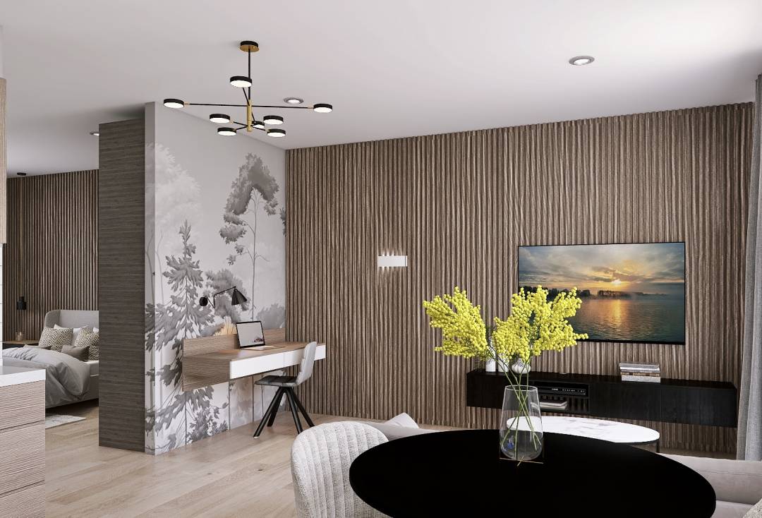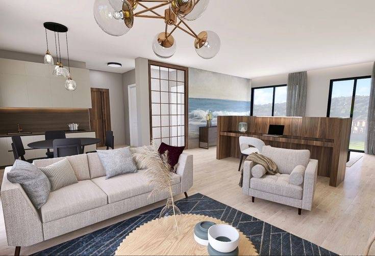 Décoration et aménagement de suites dans une grande ferme entièrement rénover pour en faire des chambres et suites d'hôtes. Décoration du coin privée avec chambre et salon cuisine.