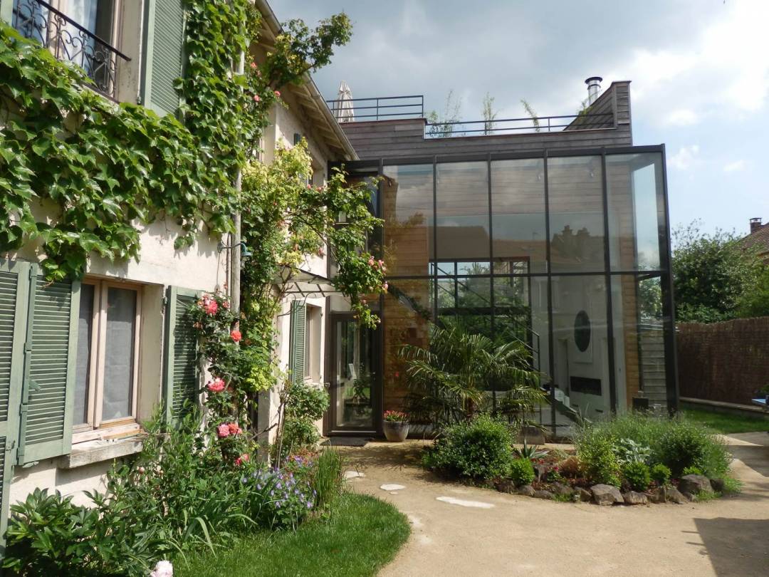 Famille recomposée, de nombreux enfants, le projet consiste en la création d’une suite parentale, un espace de vie permettant de réunir toute la famille, un sous-sol abritant les locaux technique, une salle de jeux, un bureau (transformable en chambre d’amis), une salle de bains, une cave. Situés sur les hauteurs de Sucy-en-Brie, les Maîtres d’Ouvrage souhaitaient également la création d’une toiture terrasse accessible, permettant de profiter pleinement de la vue sur Paris, et la tour Eiffel. La structure de la toiture terrasse est conçue pour accueillir, à terme, un SPA. La toiture terrasse, traitée sur deux niveaux différents pour répondre aux contraintes des hauteurs maximales et des vues, sera accessible depuis un escalier extérieur. Le bâtiment d’extension sera implanté perpendiculairement à la maison existante. En ossature bois, il est revêtu de Mélèze Il s’organise sur un sous-sol total, un rez-de-chaussée dont une partie en double hauteur, un étage partiel accueillant la suite parentale, une toiture terrasse accessible. La verrière abritant l’escalier permet également d’éclairer le sous-sol en second jour. Les deux façades principales sont largement vitrées pour permettre la transparence sur le jardin en fond de parcelle. Le déplacement des espaces de vie dans le RdC de l’extension, permet la libération d’une partie du rez-de-chaussée existant, dans laquelle sera installée une chambre.