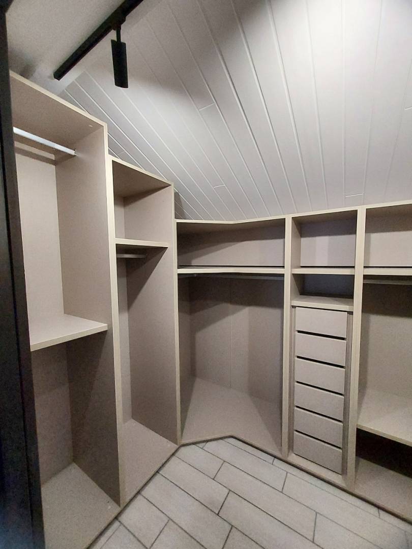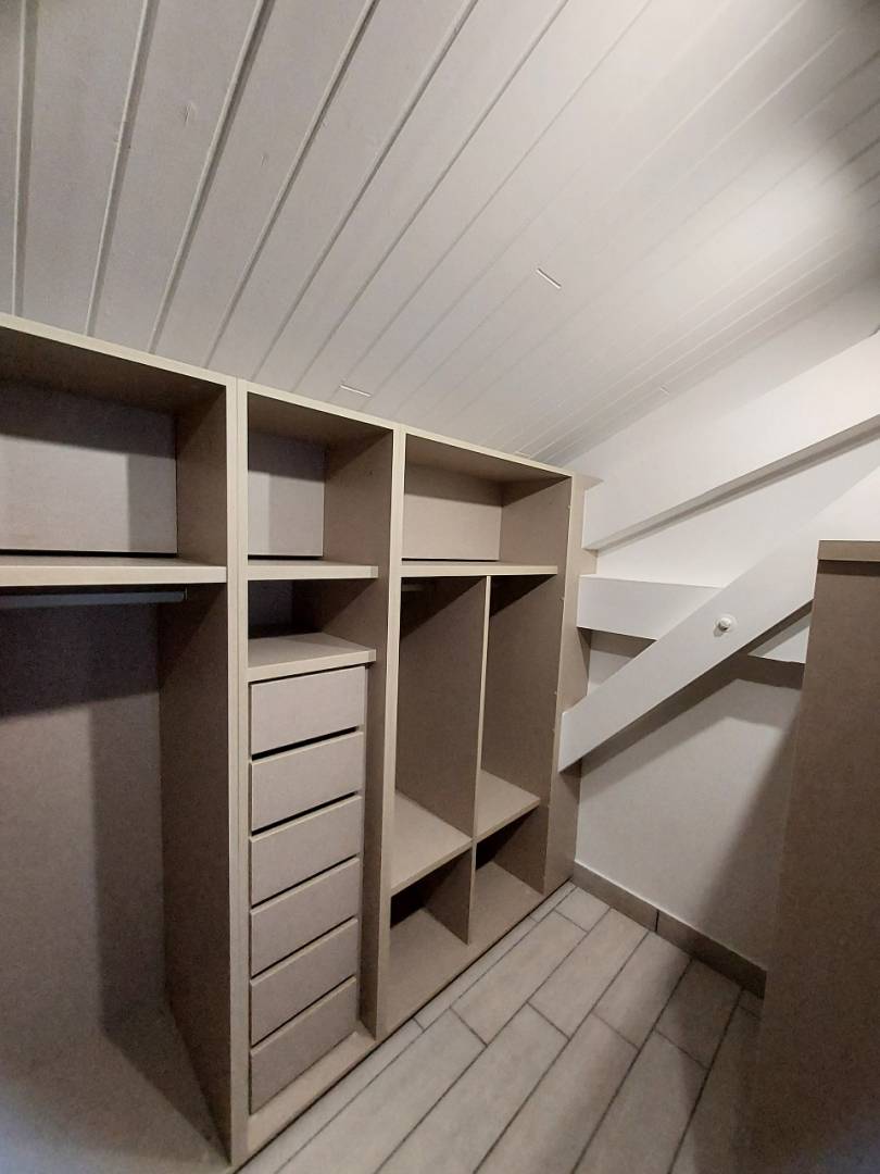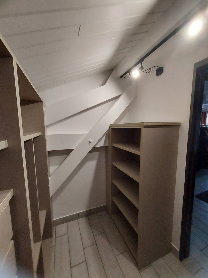 La problématique était de s'adapter à l'environnement. Le dressing est situé dans un chalet avec de nombreuses poutres et une sous pente.