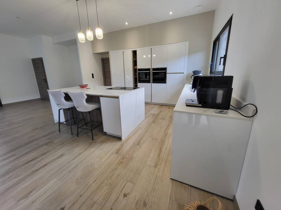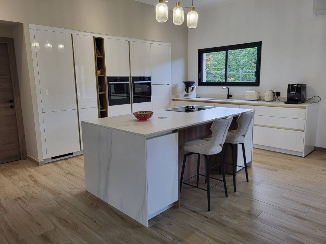 Cuisine blanche et dorée avec plan en céramique.