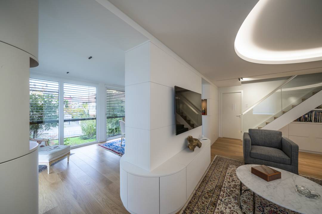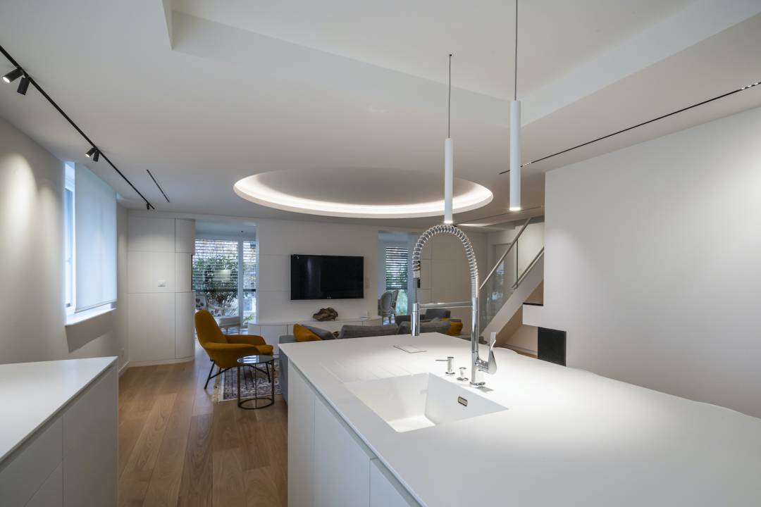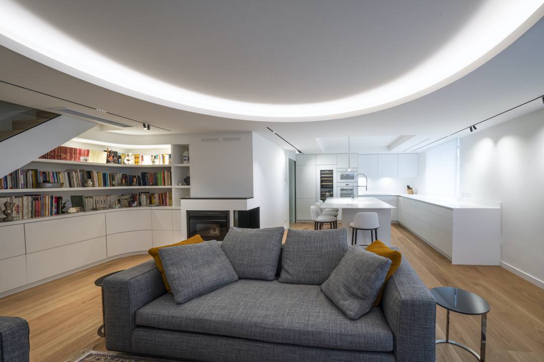 Voyage dans le futur pour cette maison traditionnelle Alsacienne, qui, par le déplacement de la cuisine à la place de la salle à manger, revêt ses habits des plus futuristes Tout y passe, du chauffage au sol à la climatisation cachée dans les faux plafonds, des cheminées à l’escalier avec garde-corps en verre, cette rénovation de fond est vraiment très contemporaine L’espace à vivre est composé d’un parquet chêne en lames larges et des murs lisses en plâtre ou en bois en laqué blancs, qui accueillent tv et rangements, cheminées et niches décoartives.