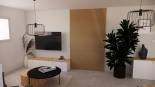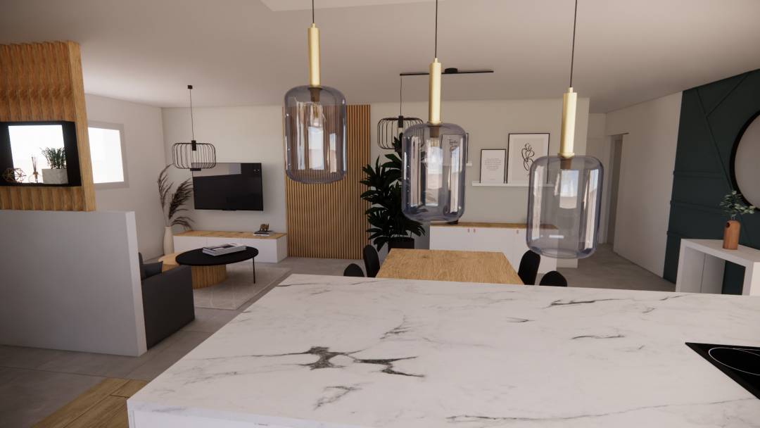 Pièce à vivre d'une maison neuve avec une atmosphère chaleureuse mise en avant avec des touches de bois.