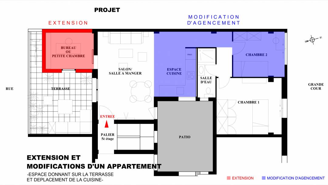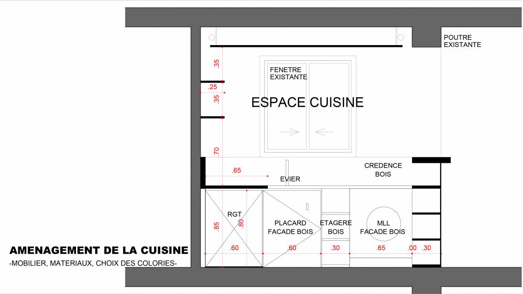 Suppression de l'ancienne cuisine et positionnement de la nouvelle cuisine au contact du séjour.