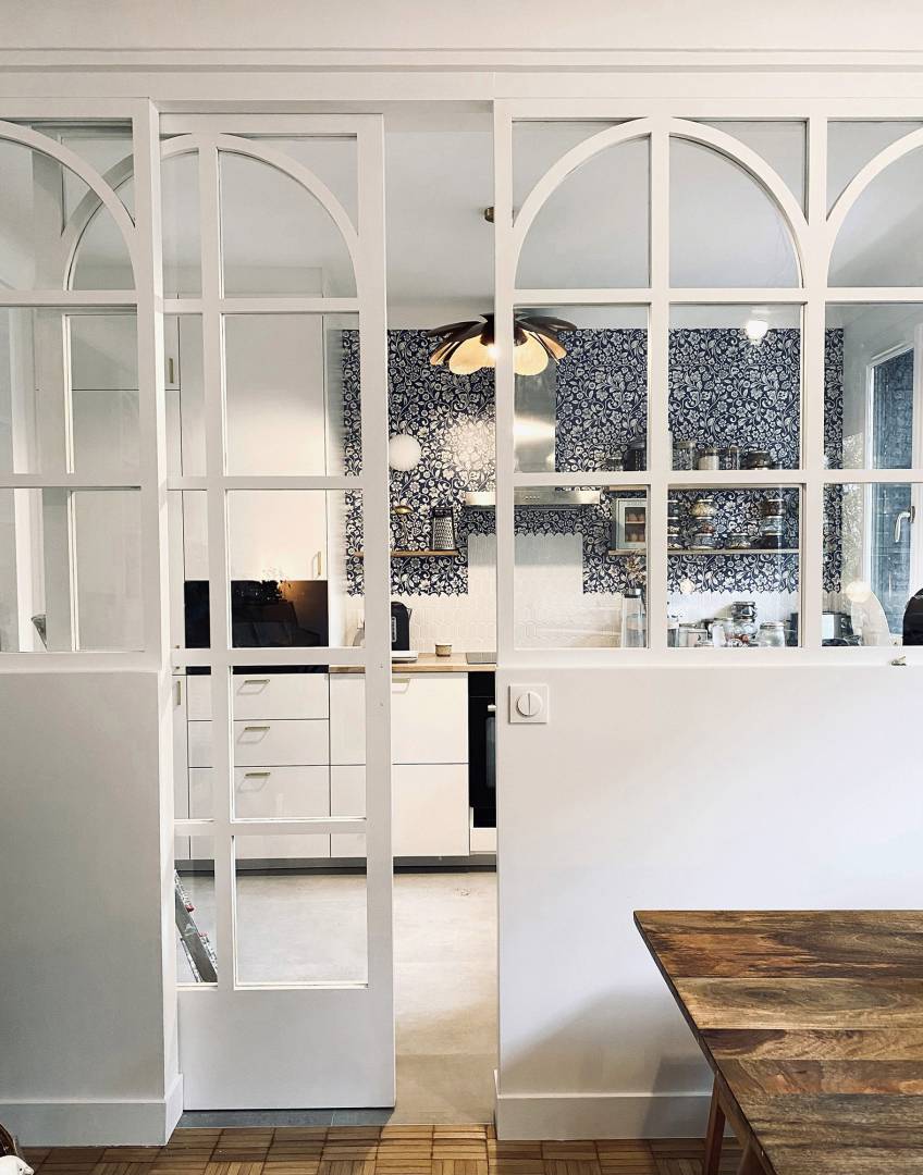 Nous avons ouvert la cuisine et restructuré tout l'espace jour avec des verrières dessinées sur mesure.