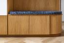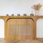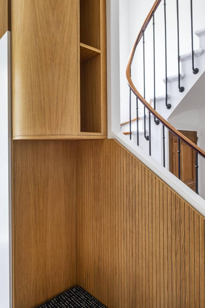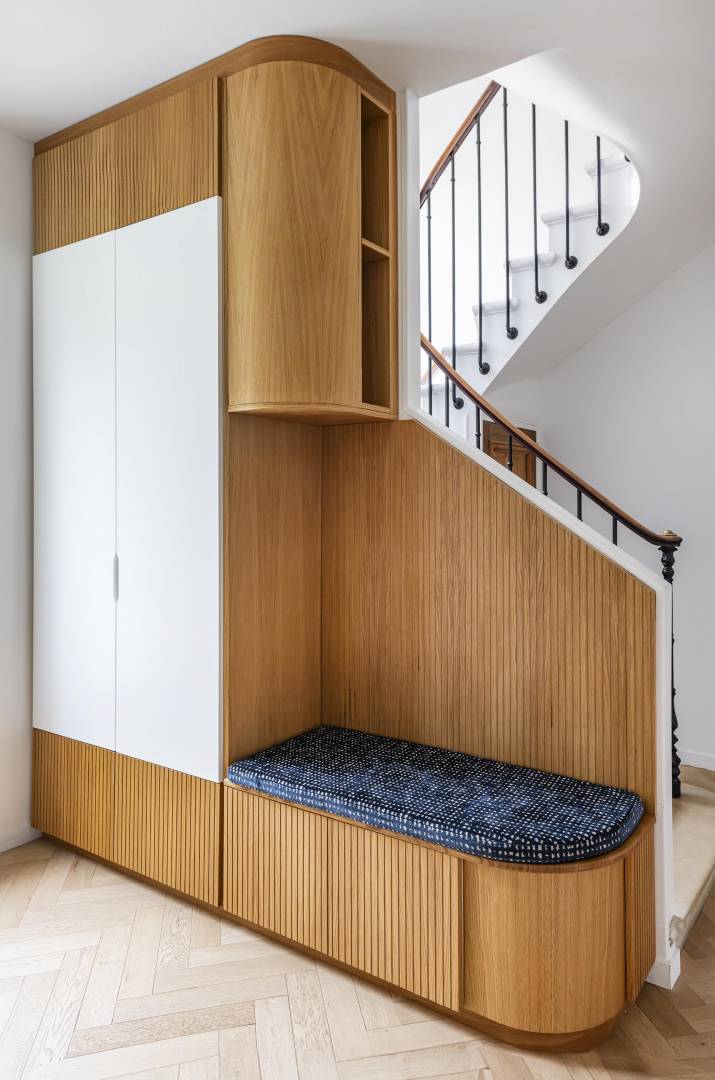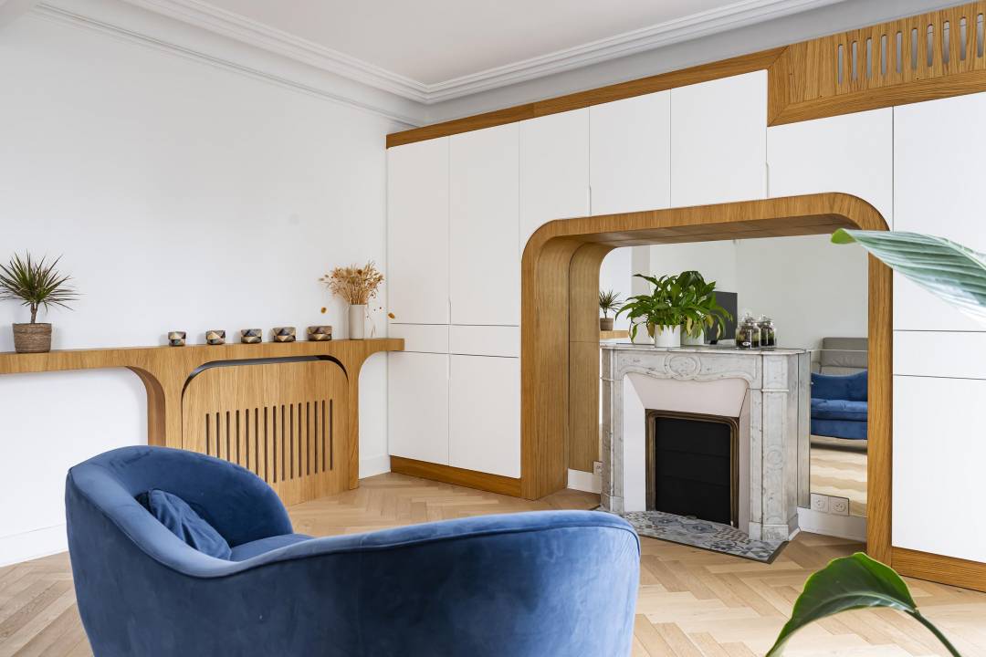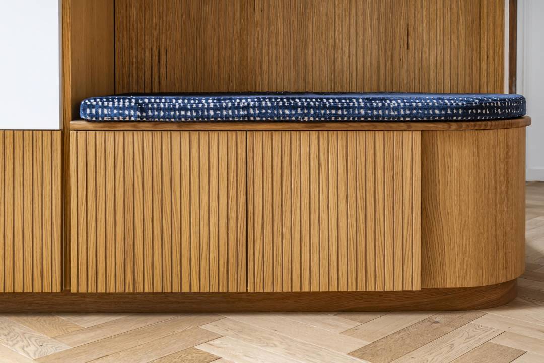 Suite à l'achat de leur maison, mes clients souhaitent rendre les espaces du rez-de-chaussé fonctionnels. Nous nous concentrons sur l'entrée et le salon pour y créer du rangement. Dans l'entrée un meuble épouse le mur soutenant l'escalier. On y range manteaux et vestes, on s'asseoit pour enfiler nos chaussures, rangées sous la banquette. Le chêne strié rythme l'ensemble. Dans le salon s'installe un module encadrant la cheminée. Le miroir apporte de la profondeur à cette partie de la pièce pensée comme un salon où l'on reçoit, un salon de lecture ou de thé. La vie de famille prend place et se dissimule derrière chaque porte.