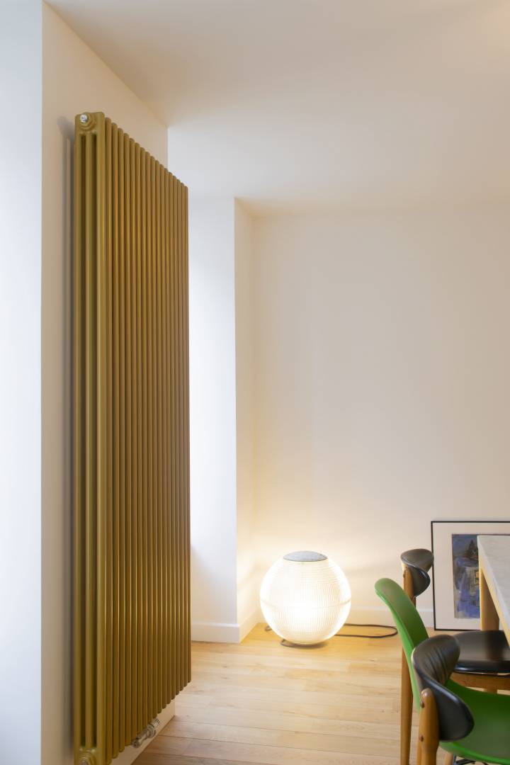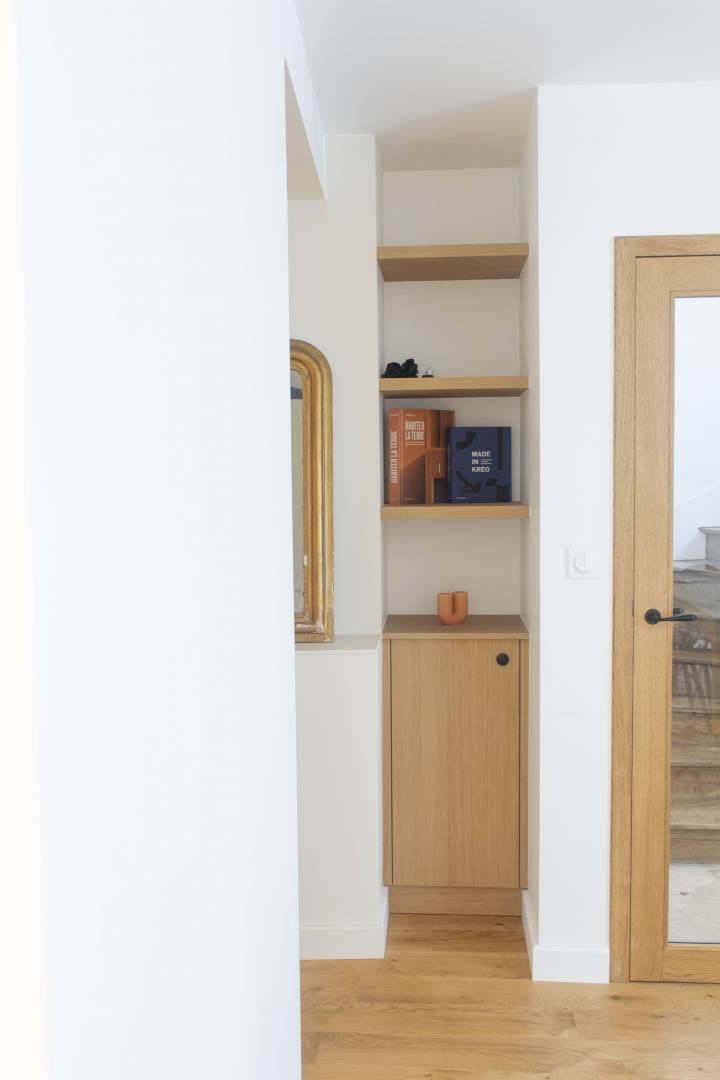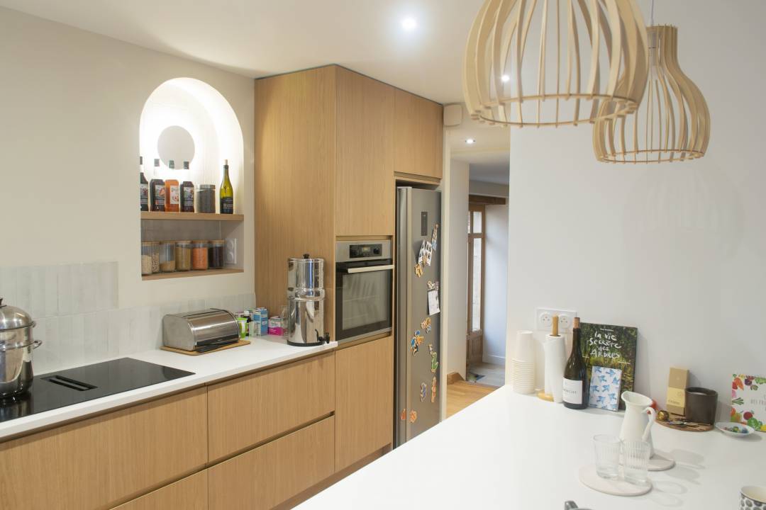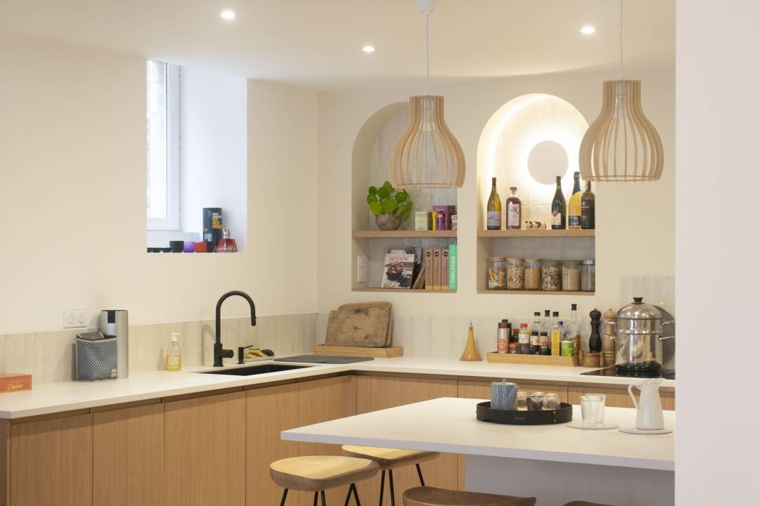 Réaménagement et rénovation partielle d’une maison de ville de 1870 à Nuits-Saint-Georges, Bourgogne Dans le cadre de ce projet, l’espace de vie de cette maison de ville ancienne a été réorganisé pour allier modernité et fonctionnalité, tout en respectant les travaux de rénovation déjà entrepris par les clients. Une attention particulière a été portée au lien et à l’harmonie entre le nouvel aménagement et le salon, déjà rénové. L’ouverture des volumes a permis de fluidifier la circulation et d’optimiser la lumière naturelle. La cheminée, élément technique indispensable au maintien de la structure, a été intégrée comme une contrainte à contourner. Elle sert désormais de point de regroupement pour les différents éléments techniques, afin de libérer l’espace et maximiser sa fonctionnalité. Une cuisine ouverte a été créée pour offrir une connexion naturelle avec le salon, tandis qu’une verrière a été installée pour apporter une touche contemporaine et mettre en valeur l’escalier d’époque. Enfin, ce projet s’est inscrit dans une démarche de rénovation énergétique, visant à améliorer le confort tout en réduisant l’impact environnemental de la maison