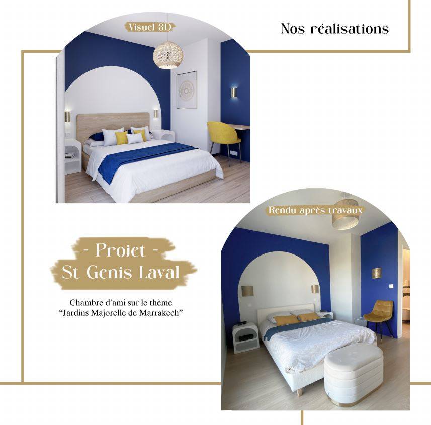 [Projet St Genis Laval] Aide à l'aménagement et la décoration de plusieurs pièces pour la surélévation de cette maison. Voici ici la chambre d'amis avec le visuel 3D avant travaux, et la réalisation après travaux.