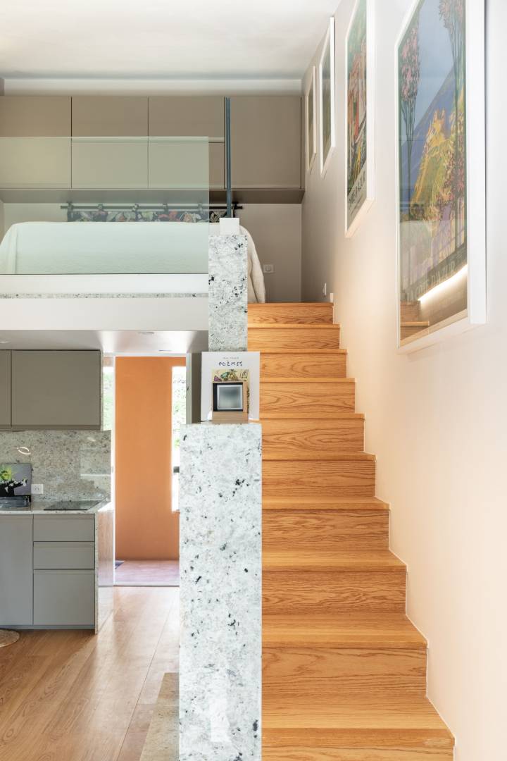 Repenser l'escalier qui mène à la mezzanine pour créer du rangement dans l'espace jour.
